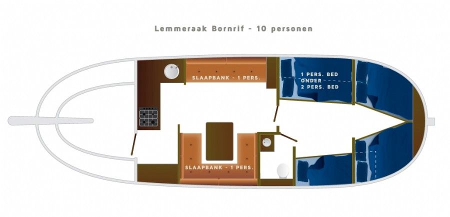 The Bornrif has 8 regular berths + 2 berths in the roof / seating area