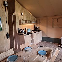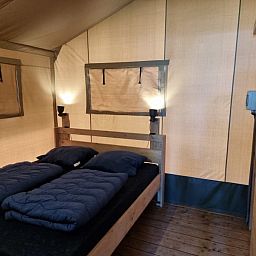 Cette tente de safari joliment meublée dispose d'une surface habitable d'environ 50 mètres carrés, avec des places debout dans toute la tente et une belle terrasse spacieuse avec un auvent. La cuisine entièrement équipée est dotée d'une plaque à induction à 4 feux. A l'arrière se trouvent deux cabines de couchage et un lit de camp pour 2 personnes. L'une des cabines dispose d'un lit double et l'autre d'un lit superposé. La tente safari dispose également de sa propre salle de bains.