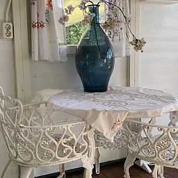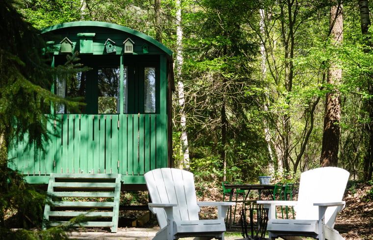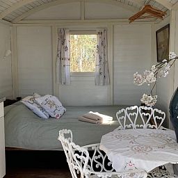 Un wagon-lit simple, mais avec tout ce qu'il faut. Comme un réfrigérateur, un chauffage électrique et un lit double. Et beaucoup d'intimité. Et, bien sûr, sa propre cheminée et son coin salon couvert à l'extérieur. Un endroit charmant pour se détendre. Et se réveiller tôt avec le chant des oiseaux.