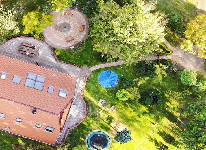 Autour de la maison de campagne se trouvent plusieurs espaces pour s'asseoir, des chaises longues, un trampoline et un foyer.