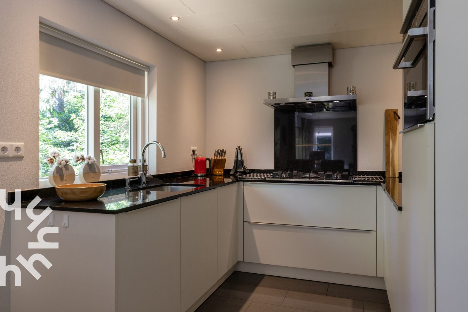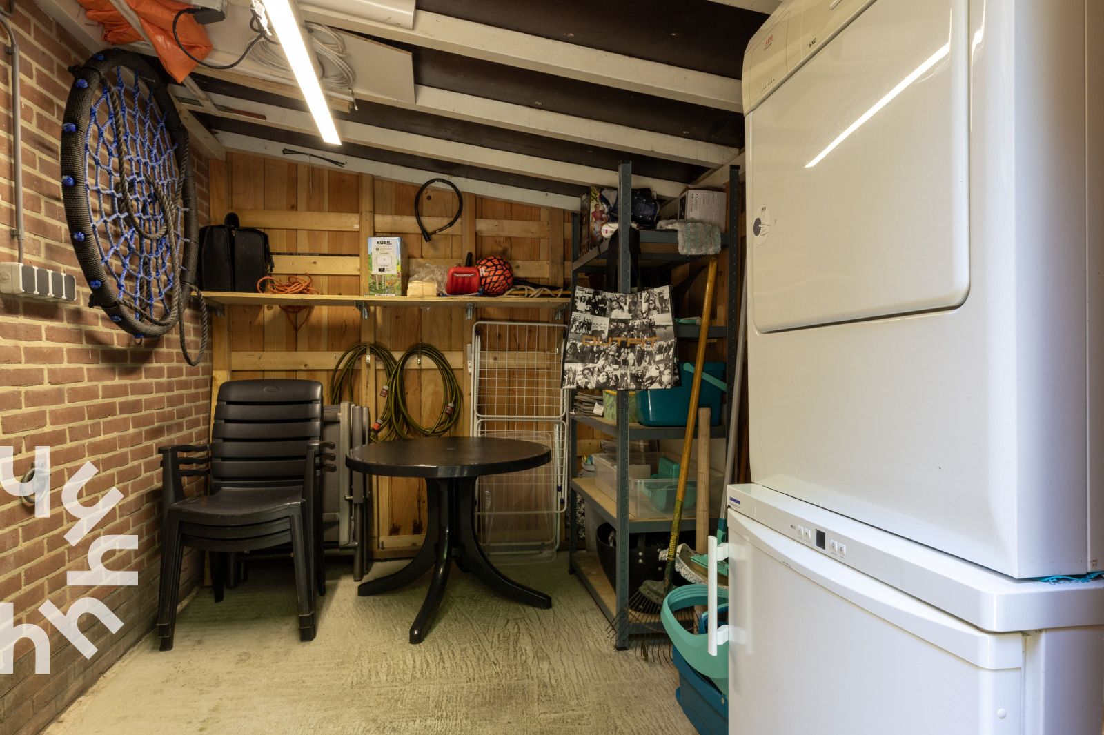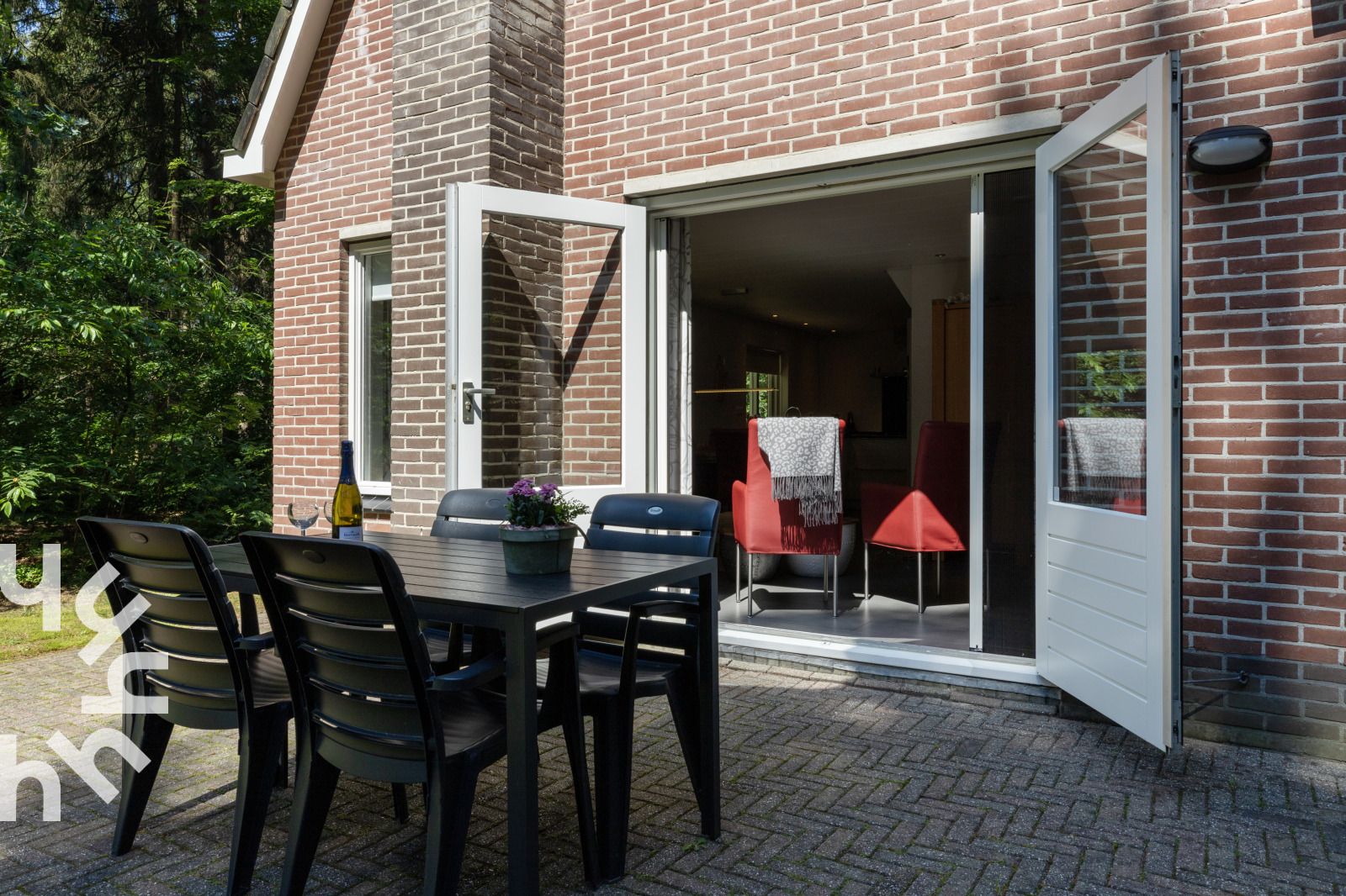 Salon confortable avec portes-fenêtres donnant sur la terrasse. Il y a le WIFI et une télévision. La cuisine ouverte est équipée, entre autres, d'un lave-vaisselle, d'un combiné magnétique, d'une cafetière Senseo, d'une bouilloire, d'une plaque de cuisson à cinq feux avec hotte aspirante, d'un réfrigérateur et d'un lave-linge. Le sèche-linge et le congélateur se trouvent dans le débarras. La salle de bains est équipée d'un lavabo et d'une douche. Il y a des toilettes séparées.