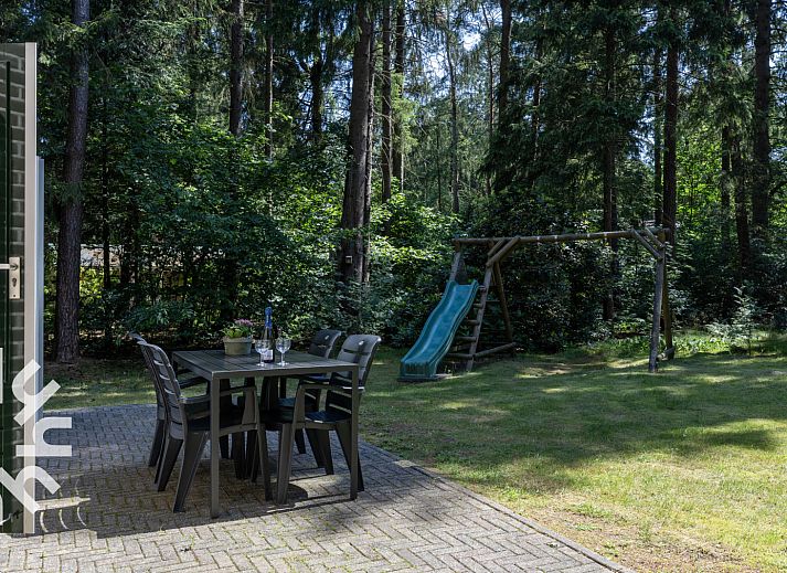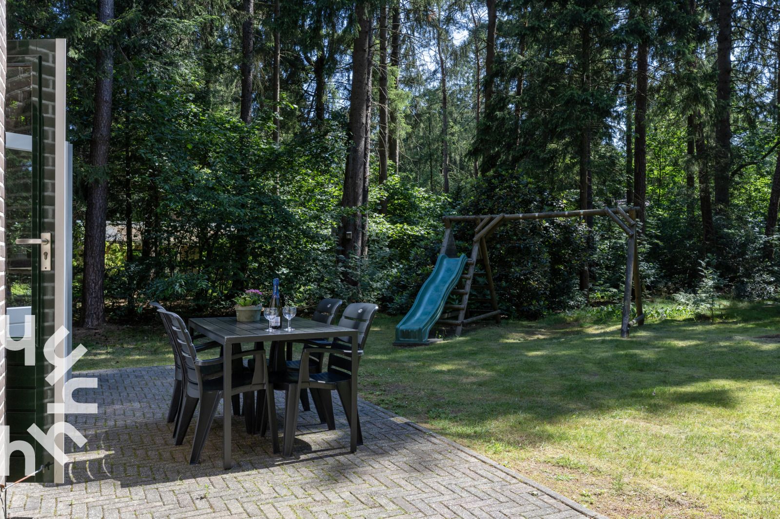 Belle terrasse avec mobilier de jardin. Pour les enfants, il y a une balançoire et un toboggan.
