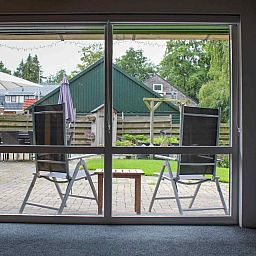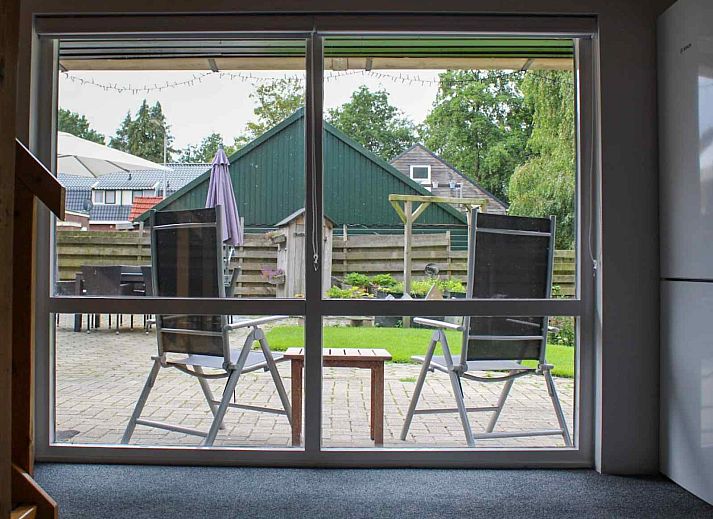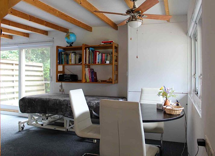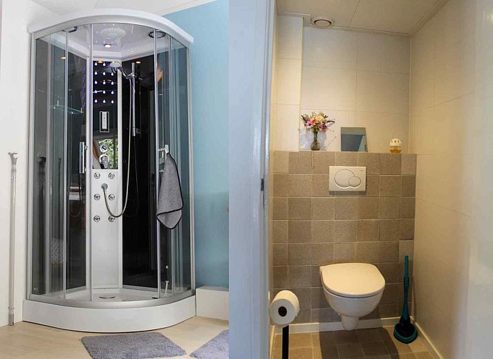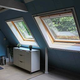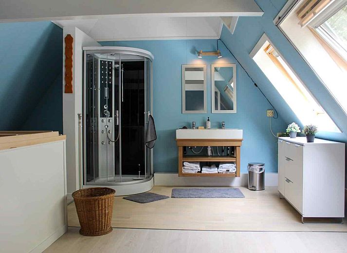Par l'escalier fixe menant au premier étage, vous entrez dans une pièce spacieuse. À gauche de l'escalier se trouve un lit simple, au fond de la pièce se trouve un lit double et un lit d'enfant. Dans la même pièce se trouve une cabine de douche de luxe avec douche de massage, musique et éclairage. À côté de la douche se trouve un double évier avec deux robinets. Grâce aux quatre grands puits de lumière, la lumière naturelle entre abondamment, mais le soir, vous pouvez fermer les stores occultants pour éviter que la lumière ne pénètre le matin. Un aspirateur, une planche et un fer à repasser se trouvent dans l'armoire. Depuis le coin salon du rez-de-chaussée, vous avez un accès direct à l'extérieur par une porte coulissante. Détendez-vous dans les deux fauteuils et profitez de la vue sur le jardin et les prairies. Le jardin du propriétaire jouxte celui de la maison de vacances, mais votre intimité est garantie. Les deux petits chiens du propriétaire se promènent parfois dans le jardin.