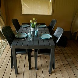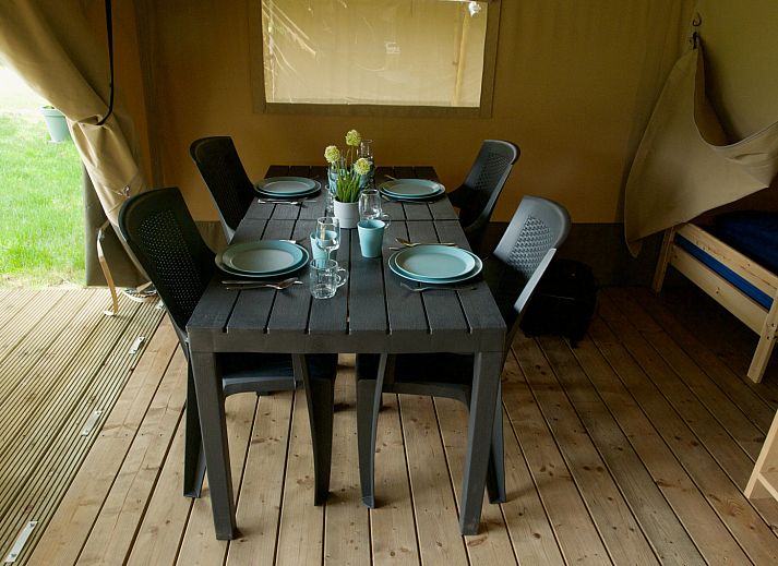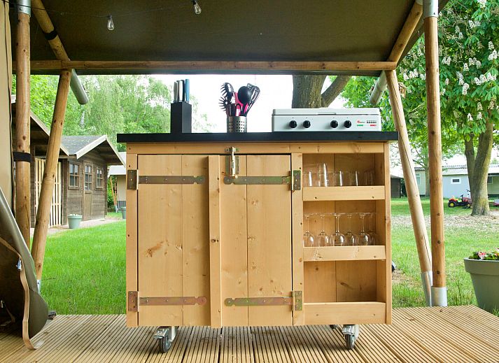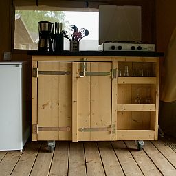 Cette tente de safari unique est entièrement équipée pour des vacances glamping parfaites ! La tente dispose d'une véranda confortable avec auvent, d'une cuisine entièrement équipée avec inventaire et de deux cabines de couchage. Il y a 2 tentes de ce type disponibles.