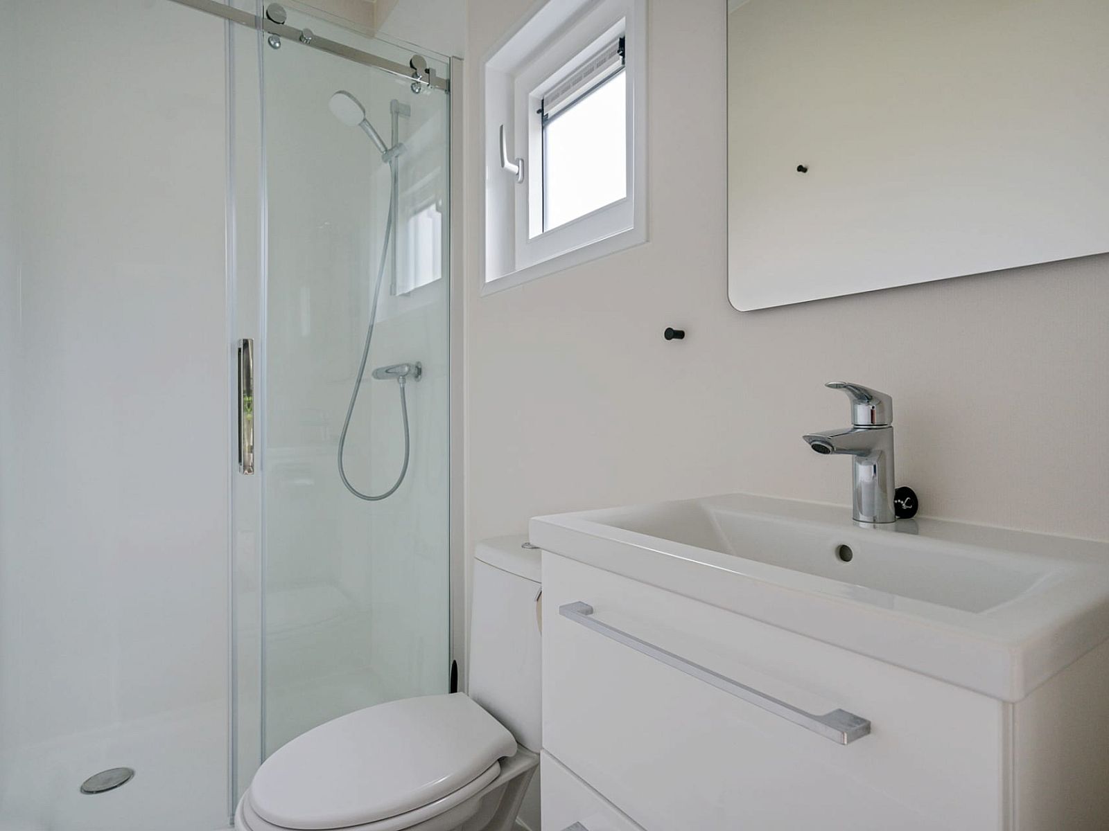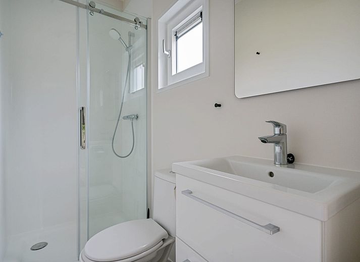 Le chalet dispose d'une salle de bain avec lavabo, douche et toilettes.