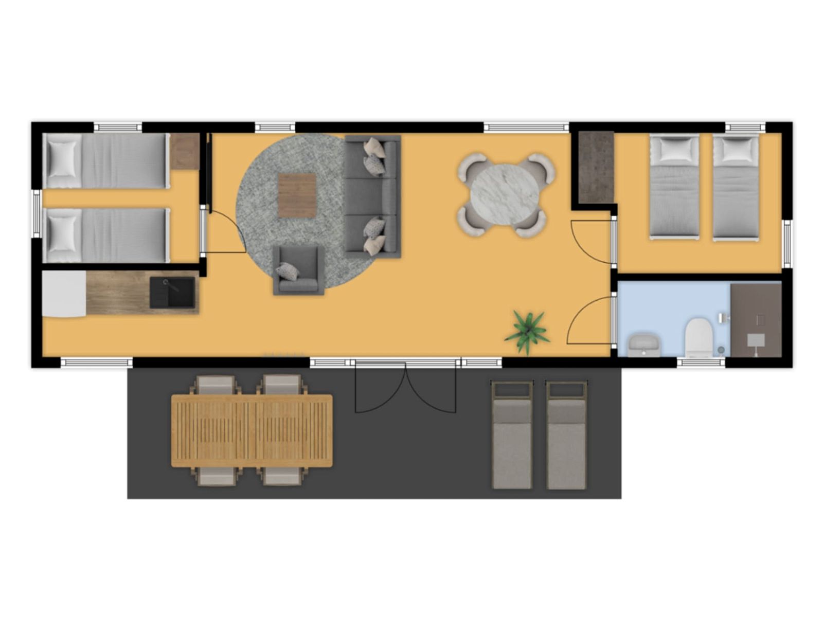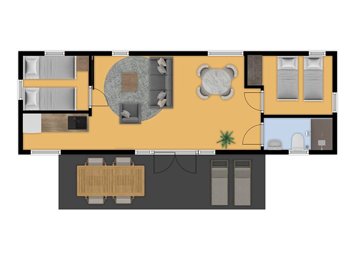 Dans le salon confortable, vous trouverez un coin salon confortable et une table à manger pour 4 personnes. Depuis le salon, vous avez accès à la terrasse extérieure par une porte coulissante.
