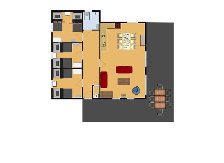 Le salon spacieux dispose d'un coin salon confortable. Vous pouvez allumer la cheminée pour plus de chaleur, mais il y a aussi le chauffage central. Depuis le salon, vous avez un accès direct à la terrasse par les portes pliantes. Le bungalow est équipé de portes extra-larges et est entièrement accessible aux personnes à mobilité réduite.