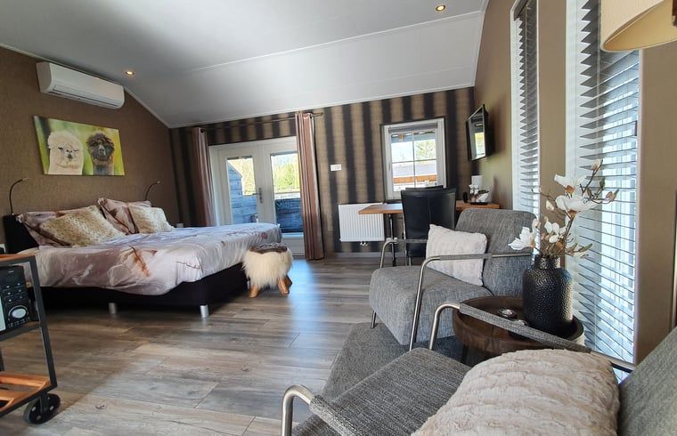 Un cottage exceptionnel dans un endroit exceptionnel !!! (cherchez "Fluitenberg" pour nos autres chalets) Il s'agit d'un B&B "Adult Only" avec 4 séjours de luxe. (numéros des autres chalets : 36052, 46395 et 57595)Depuis les deux lodges (ici l'Alpcalodge) (appartements de luxe au rez-de-chaussée), vous avez une vue directe sur les cerfs et les alpagas, qui peuvent venir et viennent jusqu'à votre terrasse. Les appartements sont équipés d'une entrée privée, d'une machine à café entièrement automatique (grains inclus), de l'air conditionné, d'une kitchenette, de portes de jardin françaises, d'une salle de bains moderne et d'une terrasse privée (partiellement couverte), d'un lit Caresse à sommier tapissier et d'une Smart TV. Les alpagas et les cerfs viennent jusqu'à votre terrasse ! Un petit-déjeuner frais est apporté à l'hébergement. Ce gîte naturel est situé dans le village boisé. 2 autres cottages sont situés derrière une maison de campagne et 2 lodges de luxe sont situés dans une cabane en bois d'origine. Café/thé gratuit. Location de vélos électriques, borne de recharge voiture/moto.