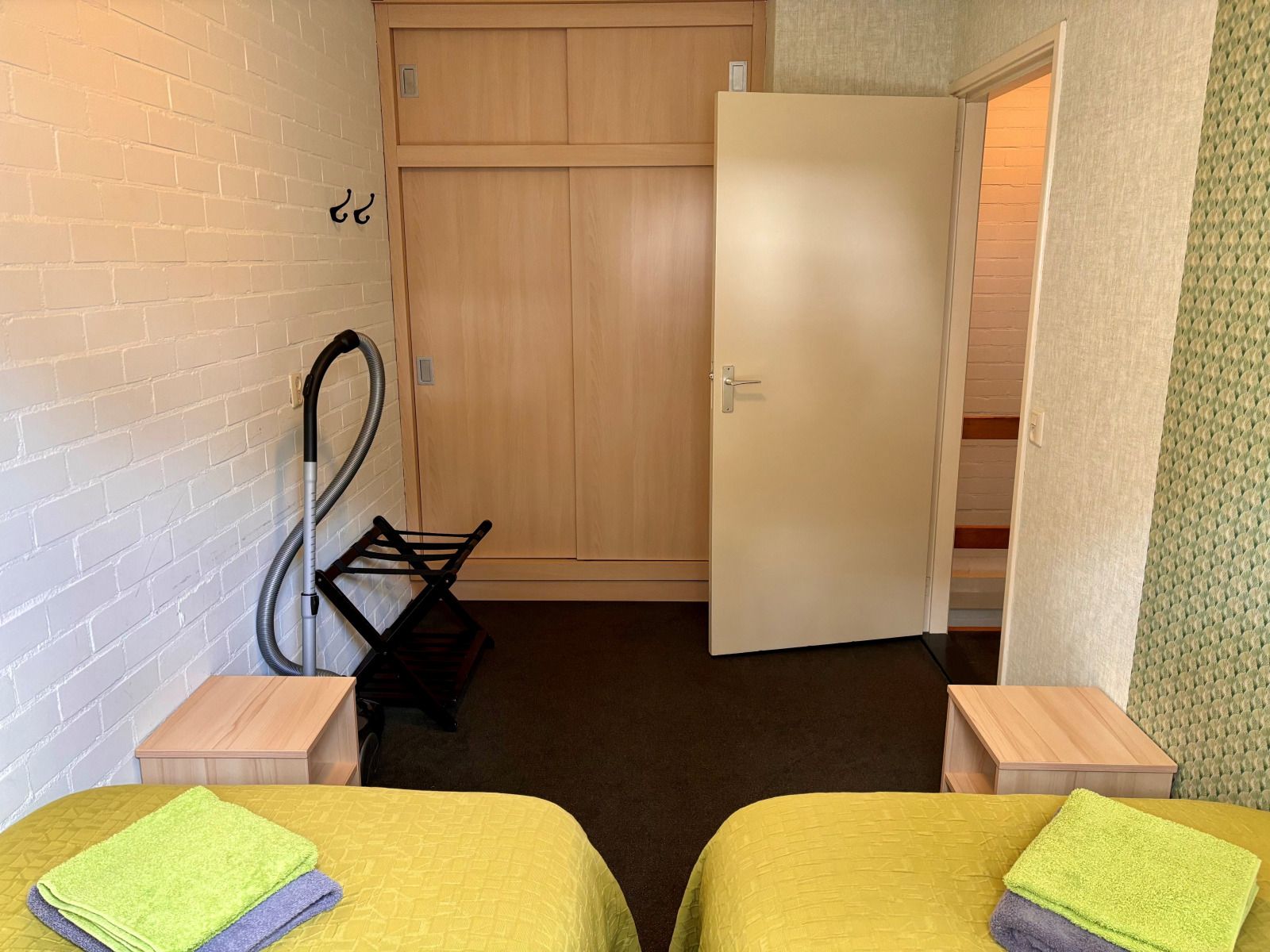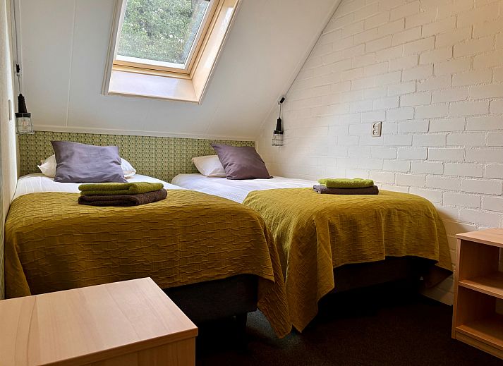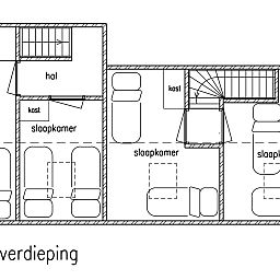 À l'étage, il y a quatre chambres à coucher. Trois chambres ont deux lits simples et la quatrième chambre a trois lits simples.