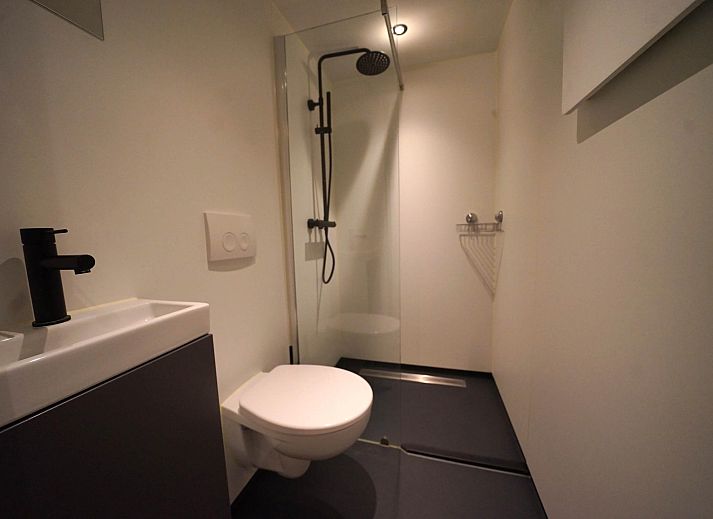 De badkamer is functioneel ingericht en voorzien van een douchecabine, wastafel en toilet.
