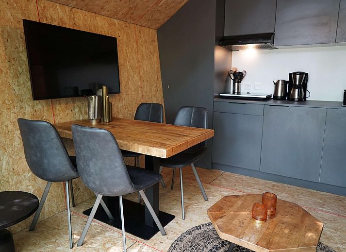 De gezamenlijke leefruimte beschikt over een gezellige zithoek met televisie en een eettafel met stoelen. De moderne keuken is praktisch ingericht en voorzien van een inductiekookplaat en een filterkoffiezetapparaat, ideaal voor een comfortabel verblijf.