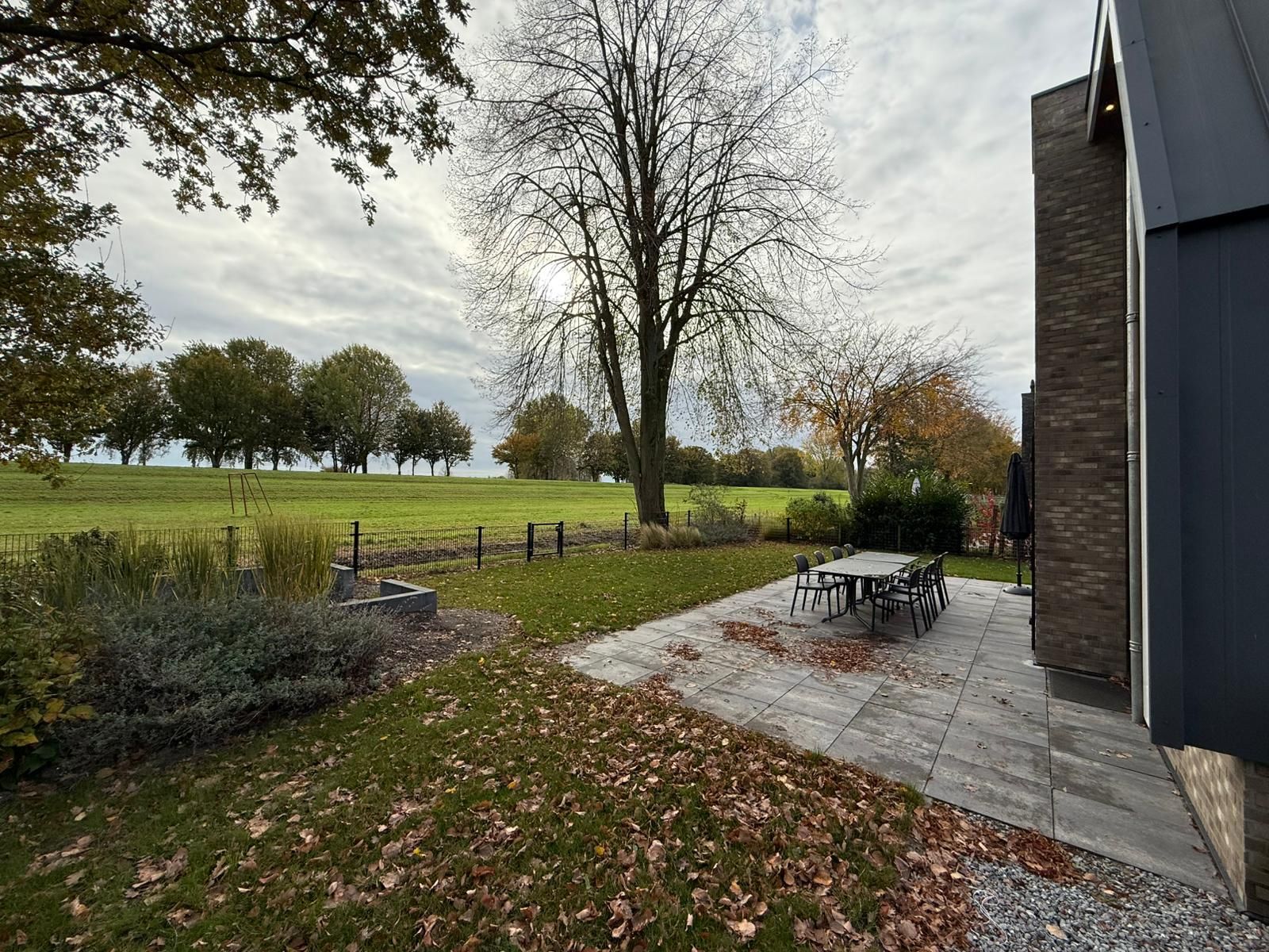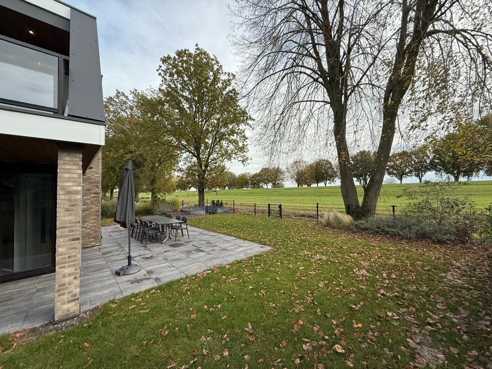 De villa onderscheidt zich door zijn harmonieus ontworpen gevel, die perfect aansluit bij het strakke stalen felsdak. De grote raampartijen en het balkon zorgen voor een prachtig panoramisch uitzicht en een overvloed aan natuurlijk licht. De stenen schoorsteen en strengpersvormige plint geven de woning karakter, terwijl de zwarte aluminium kozijnen zorgen voor een moderne uitstraling.