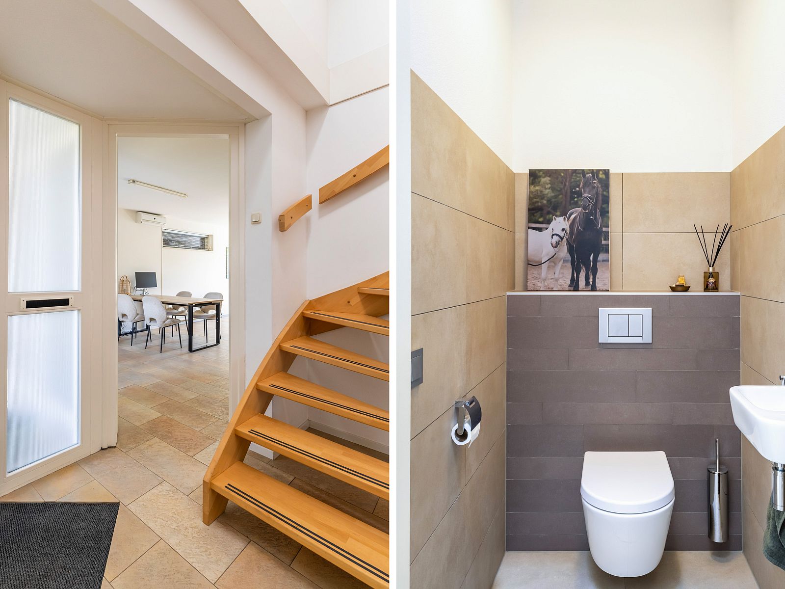 Via de entree betreedt u de centrale hal met toiletruimte, meterkast en trapopgang. Vanuit hier heeft u toegang tot zowel de woonkamer als de moderne keuken en de separate zitkamer.
