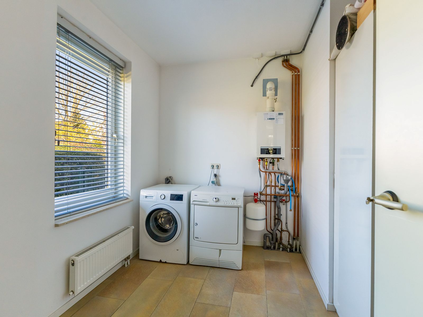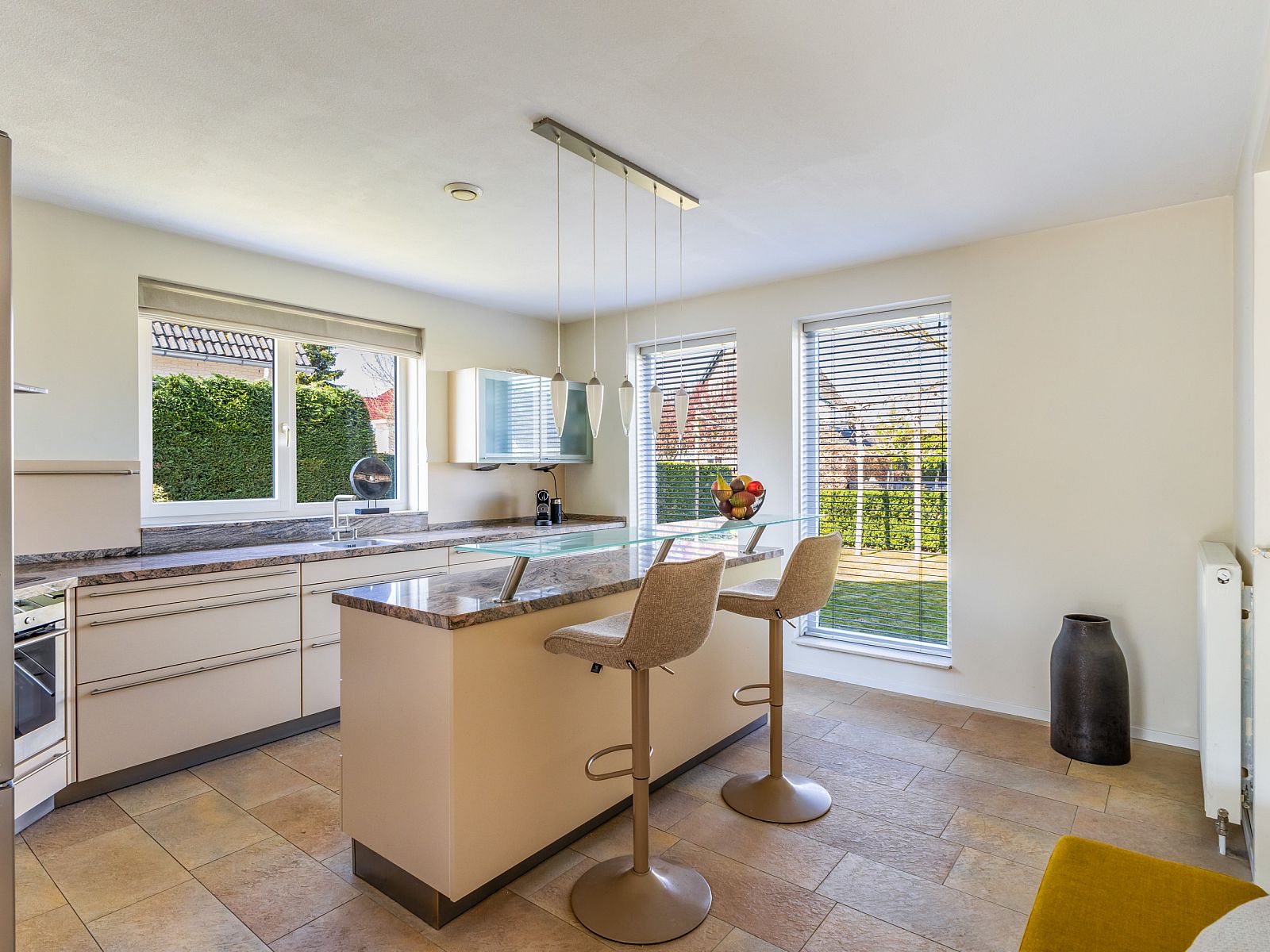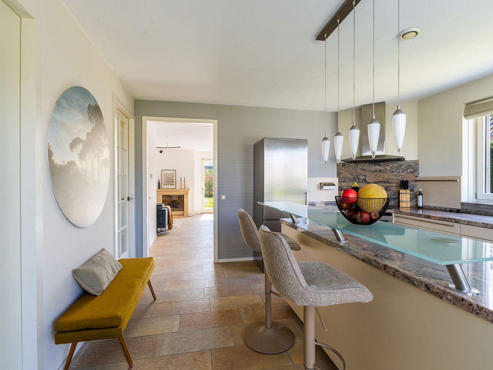 De luxe leef keuken beschikt over diverse inbouwapparatuur zoals een inductie kookplaat, een afzuigsysteem en een oven. Tevens is hier een bar gecreëerd waar u bijvoorbeeld lekker kunt na borrelen. Aansluitend bevindt zich de bijkeuken met aansluitingen voor zowel de wasmachine als de droger. Hier bevindt zich ook de CV-ketel.