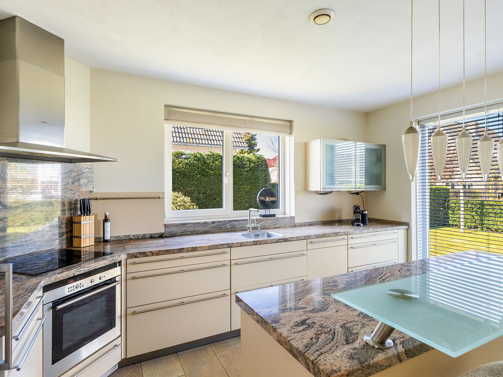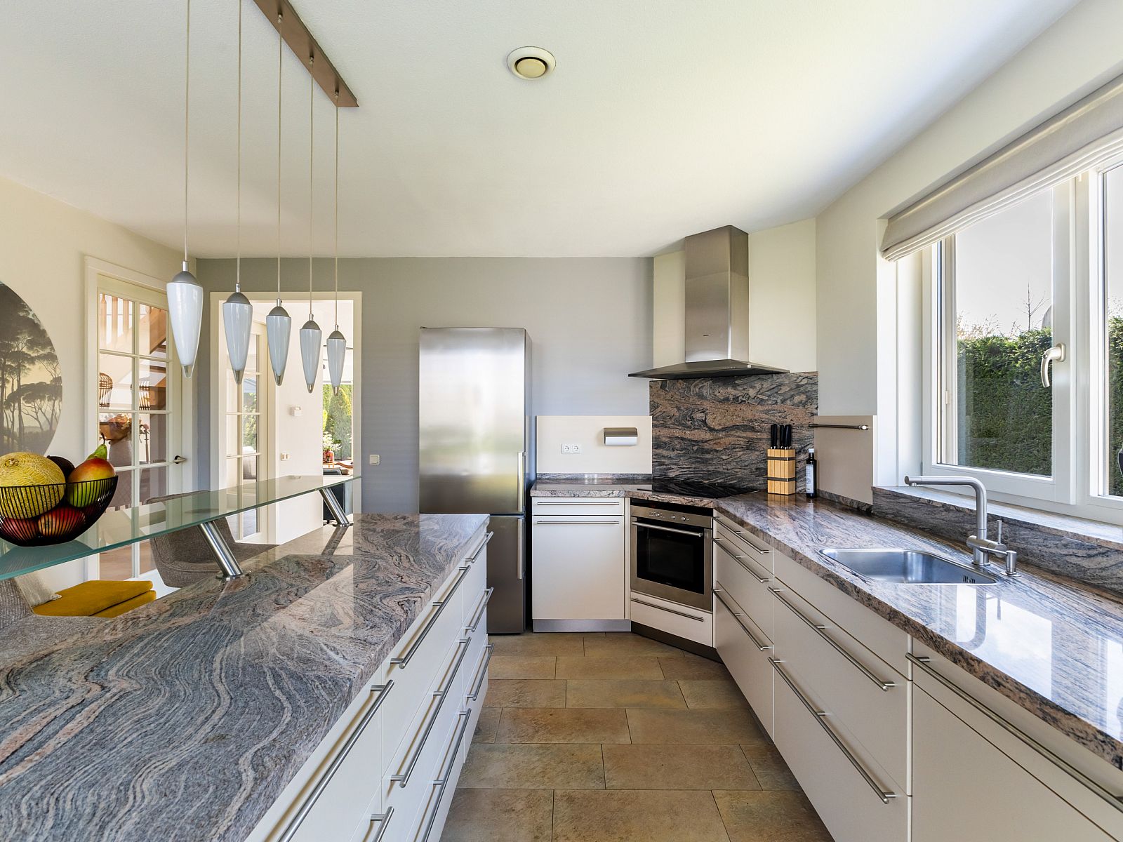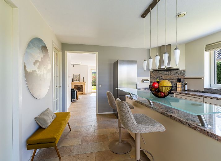 De luxe leef keuken beschikt over diverse inbouwapparatuur zoals een inductie kookplaat, een afzuigsysteem en een oven. Tevens is hier een bar gecreëerd waar u bijvoorbeeld lekker kunt na borrelen. Aansluitend bevindt zich de bijkeuken met aansluitingen voor zowel de wasmachine als de droger. Hier bevindt zich ook de CV-ketel.