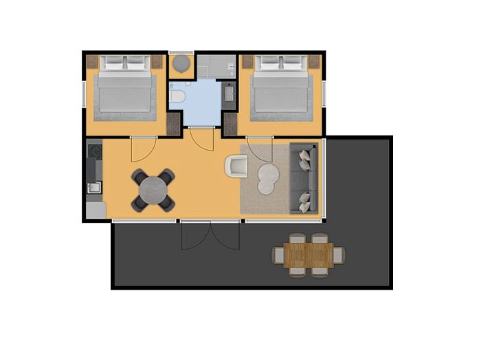 Ce bungalow de luxe pour 4 personnes dispose de deux chambres à coucher, d'une terrasse couverte et est entièrement équipé.