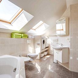 L'escalier mène au premier étage où se trouvent quatre chambres à coucher avec deux lits simples. La salle de bains est équipée d'une douche, d'une baignoire, d'un lavabo, de toilettes, d'un bidet, d'un urinoir, d'un lave-linge et d'un sèche-linge.