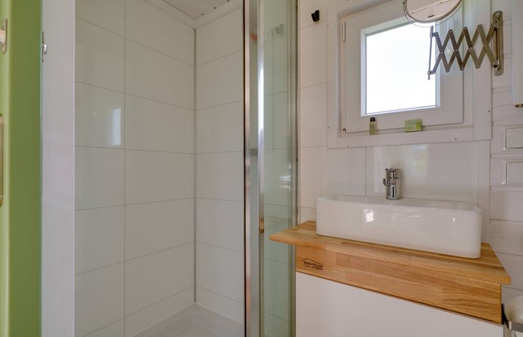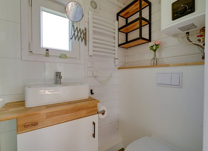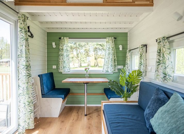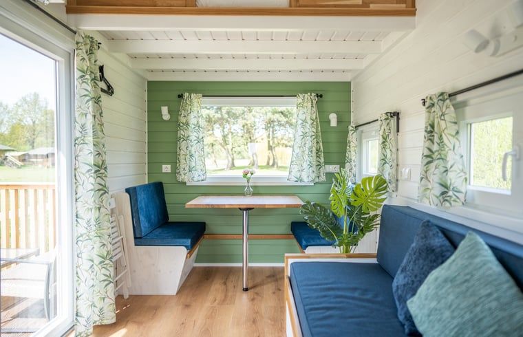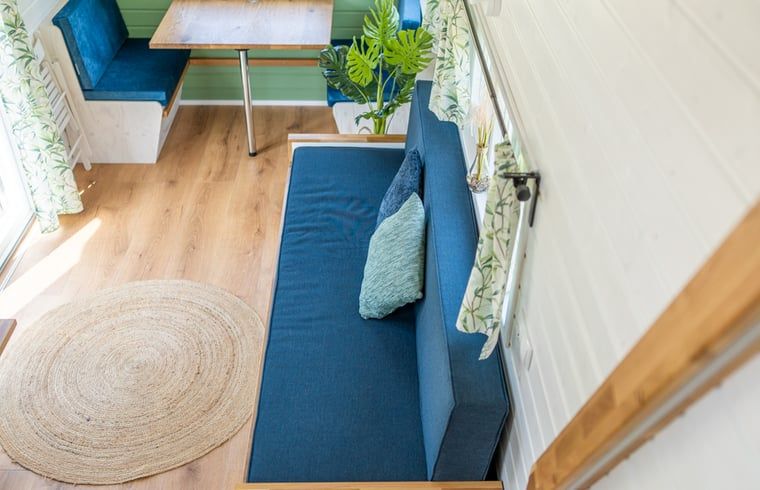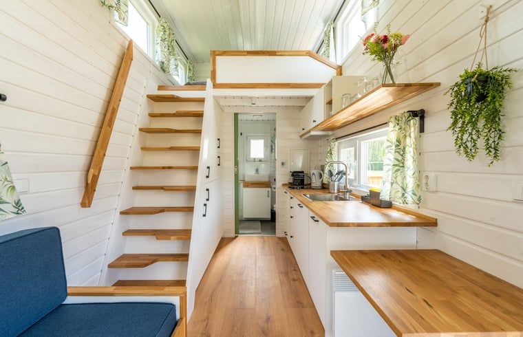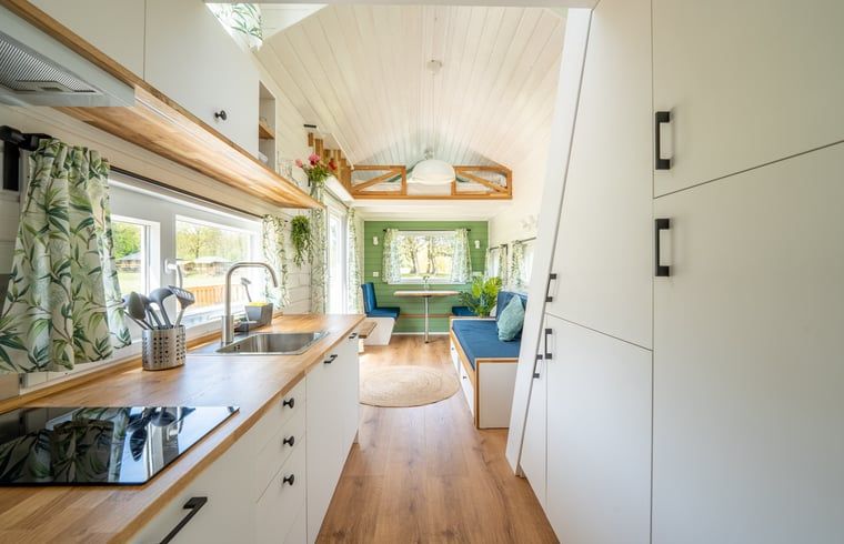 La Tiny House est un espace ouvert avec chauffage par le sol et climatisation. Vous disposez d'une cuisine complète et d'une salle de bains avec toilettes et douche. Il y a deux mezzanines avec un lit double à droite et à gauche. En bas, il y a une "dinette" : une table avec deux canapés confortables qui peuvent être transformés en lit. À côté, une banquette se transforme en lit d'une place et demie. À l'extérieur, sur la véranda privée, se trouvent un salon et une table de pique-nique pour 5 personnes.