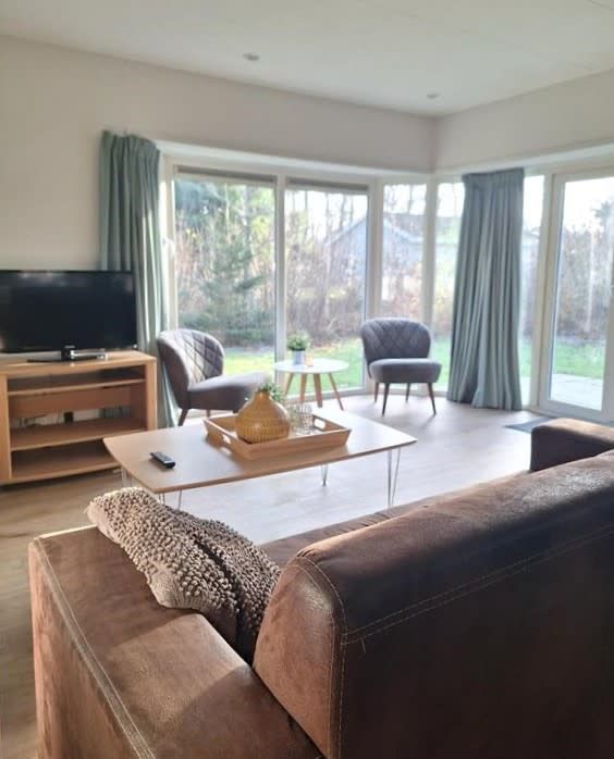 Le chalet dispose d'une salle de séjour spacieuse avec un coin salon et des portes-fenêtres donnant sur la terrasse. Grâce aux nombreuses grandes fenêtres, vous pourrez profiter de la nature environnante même à l'intérieur du chalet.