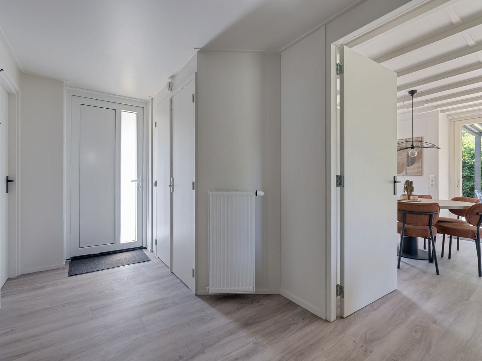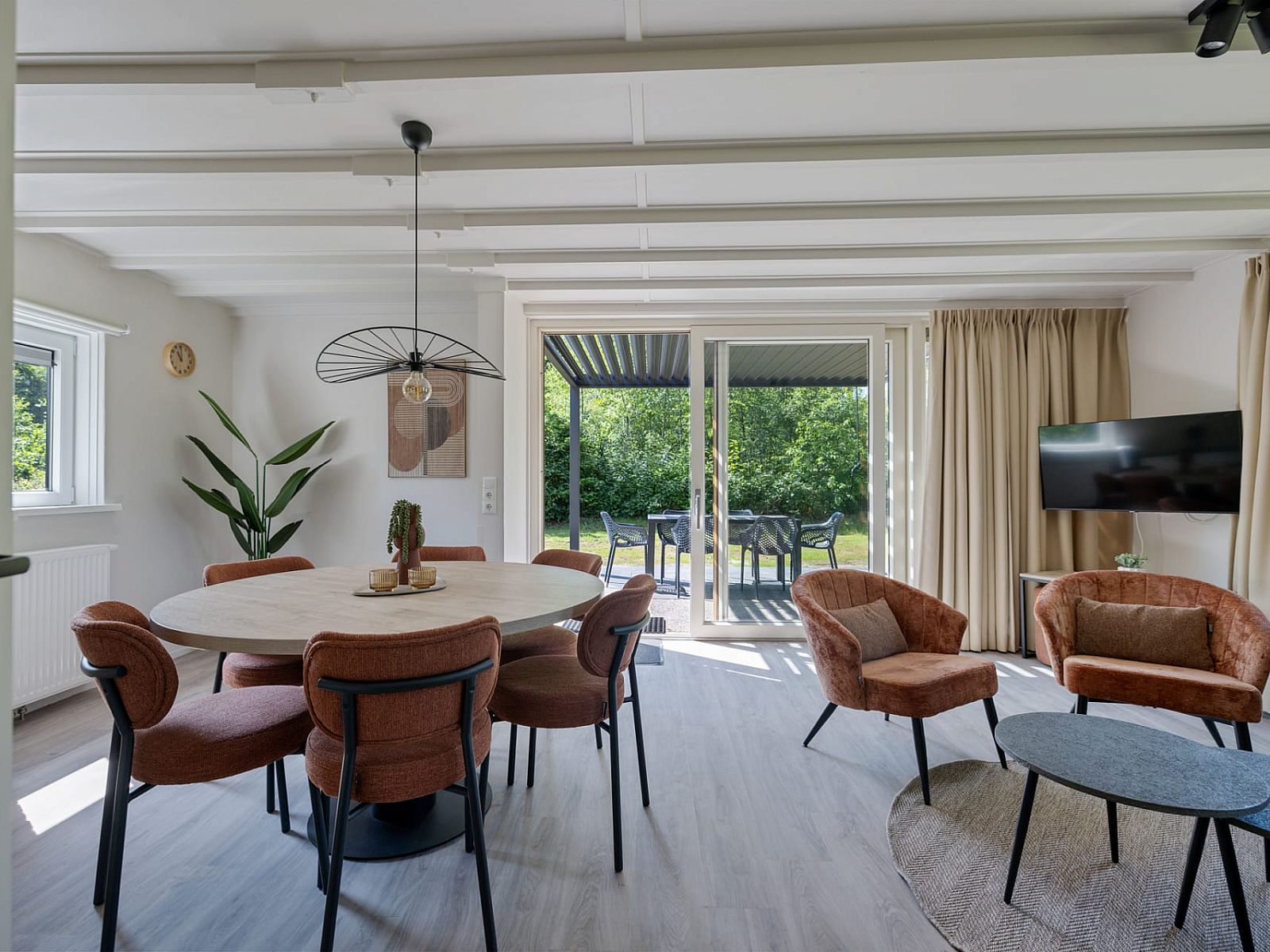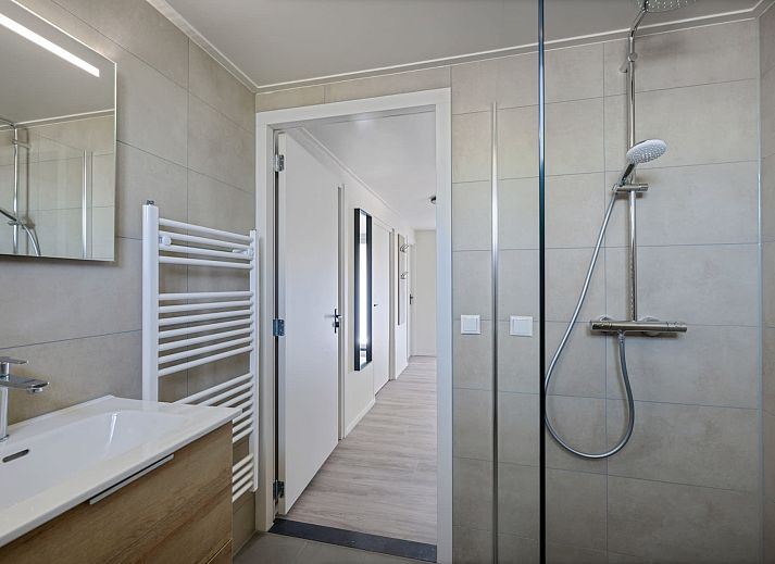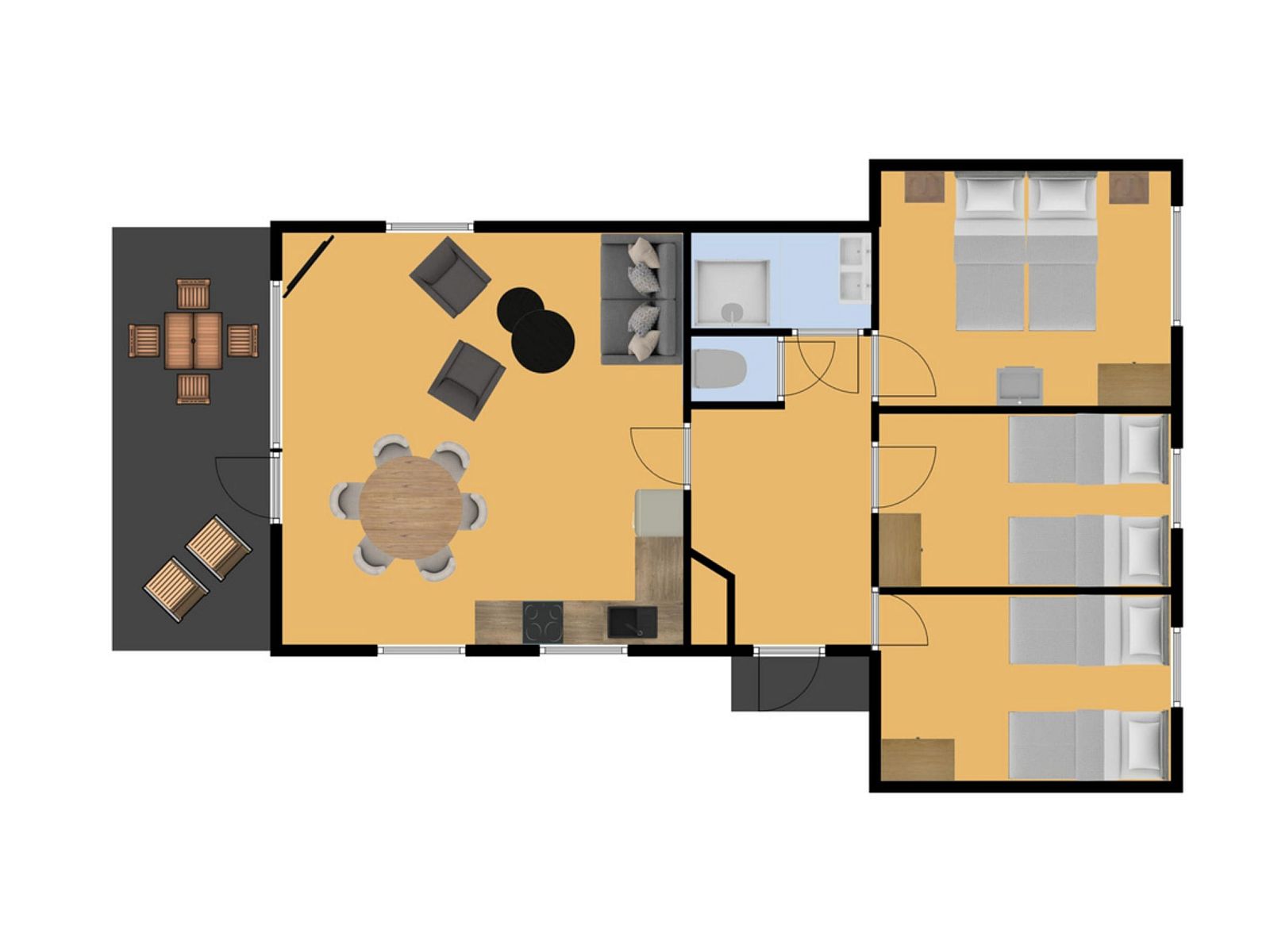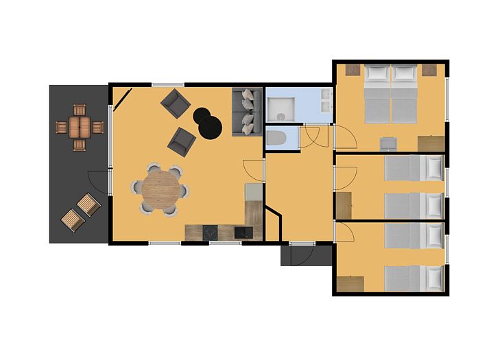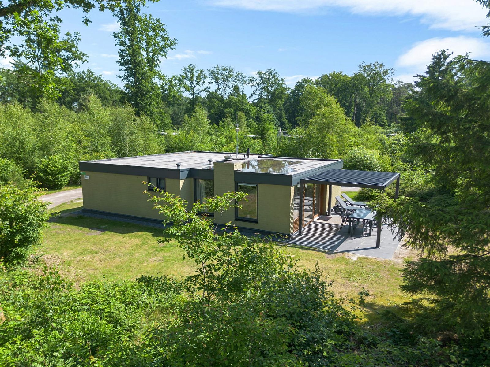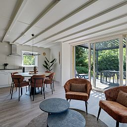 Depuis le salon, la porte-fenêtre donne un accès direct à la terrasse orientée au sud, avec un mobilier de jardin pour six personnes. Vous pourrez y profiter du soleil même au début du printemps. La terrasse est également équipée d'un luxueux auvent à lamelles réglables, ce qui vous permet de choisir de vous asseoir au soleil ou à l'ombre. Il y a deux chaises longues. Le bungalow dispose d'un parking pour deux voitures.