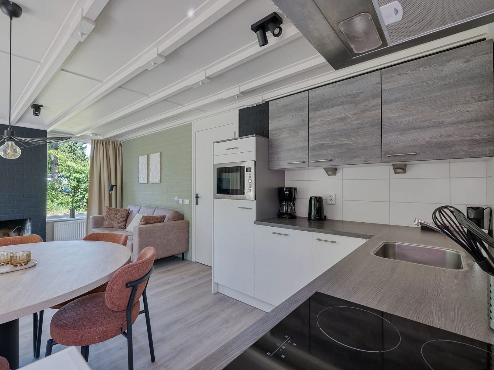 Le bungalow dispose d'une cuisine ouverte rénovée avec une plaque de cuisson à gaz à 4 feux, un réfrigérateur avec compartiment congélateur, un four à micro-ondes combiné, une cafetière à filtre et une machine Nespresso. Le coin repas peut accueillir six personnes.