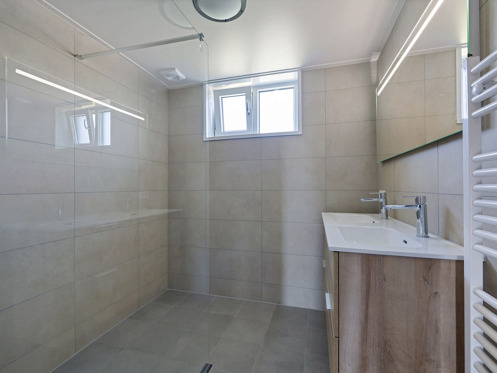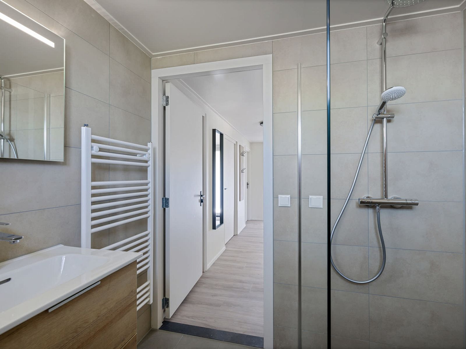 La salle de bain rénovée est équipée d'une douche et de toilettes séparées.