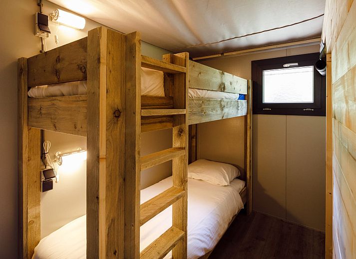 La tente villa dispose d'un lit double, d'une chambre avec deux lits simples de 0,80 m sur 2 m et d'une chambre avec un lit superposé. Tous les lits sont équipés de couettes simples. Il est possible d'ajouter un lit bébé. Pour une sensation de confort, vous pouvez séparer la chambre du salon à l'aide d'un store. Vous venez avec des amis ou pour un week-end en famille ? En accord avec la réception, vous pouvez placer votre propre tente ou caravane.