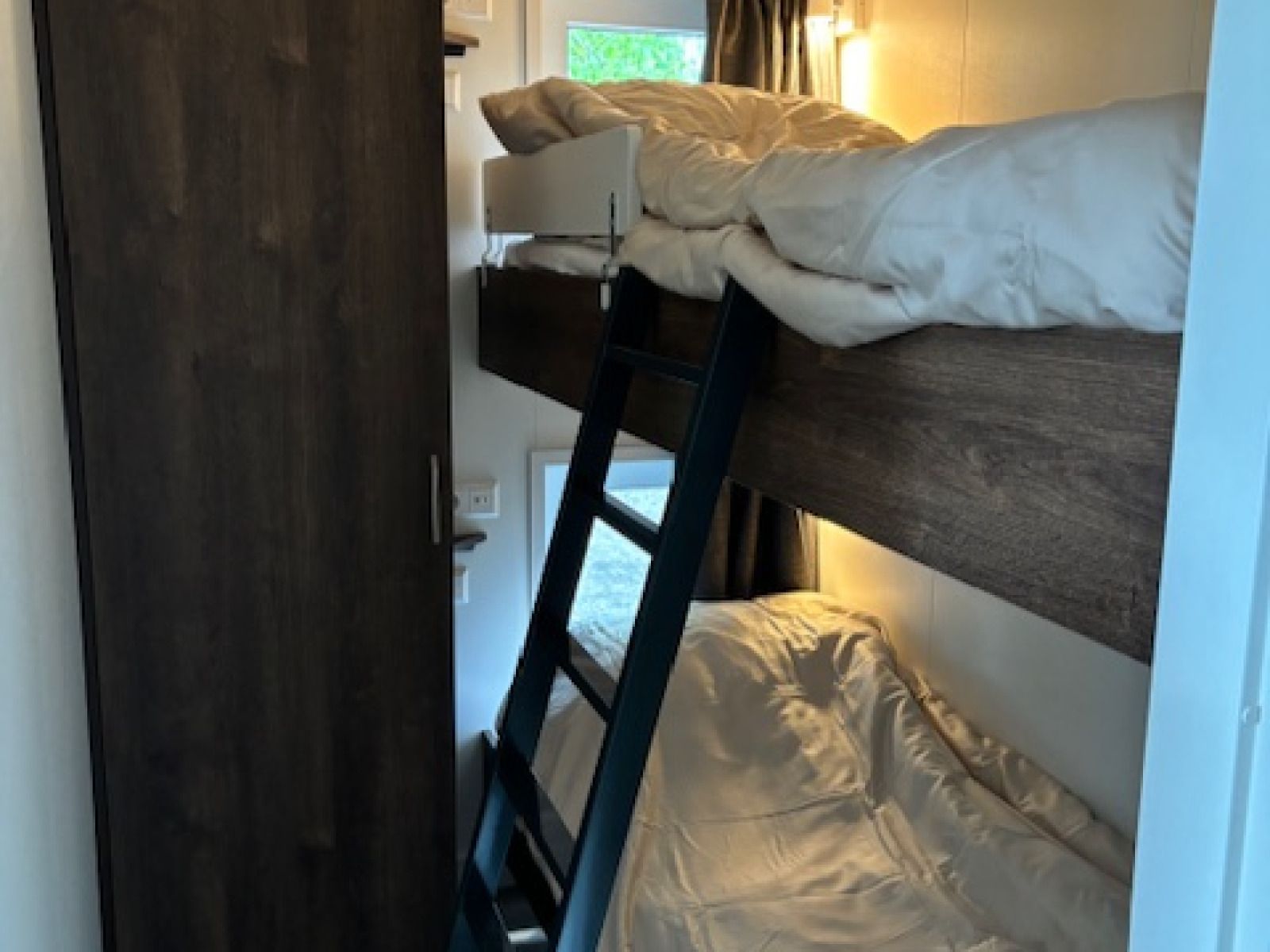 La salle de séjour dispose d'un coin salon et d'un coin salle à manger avec de nombreuses places assises. La cuisine est entièrement équipée, avec un réfrigérateur, une plaque de cuisson à induction et une cafetière à filtre. Il y a trois chambres à coucher, dont une avec un lit double. La deuxième chambre a deux lits simples et la dernière chambre a un lit superposé (80x200). La salle de bains est équipée d'un lavabo, d'une douche et de toilettes. Les portes-fenêtres du salon donnent sur une belle terrasse avec un auvent.