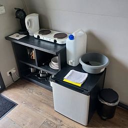 Equipement : Machine à café Dolce Gusto, bouilloire, cuisinière, réfrigérateur de camping, parasol.