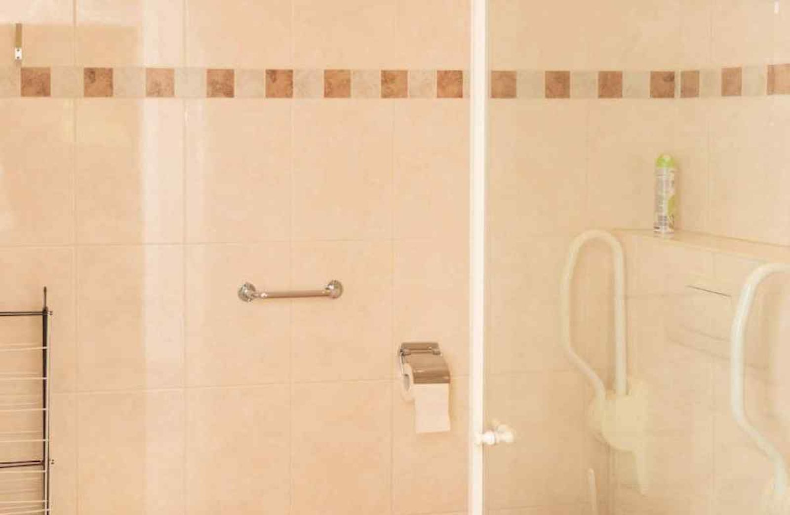 En bas, il y a une salle de bains avec coin douche, baignoire, toilettes, lavabo et machine à laver. À l'étage, il y a une salle de bains avec deux coins douche, une baignoire, des toilettes et un lavabo. Il y a un troisième et un quatrième WC dans le hall, et un cinquième WC sur le palier.