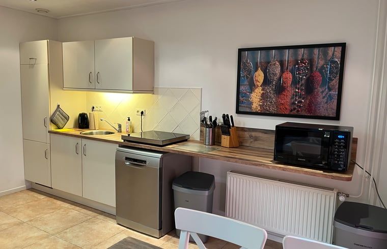 Le logement spacieux est situé dans une ancienne écurie indépendante et comprend au premier étage un coin couchage avec un sommier moderne pour deux personnes et un coin salon confortable avec une chaise longue dans le coin salon. Dans la cuisine ouverte, équipée d'une plaque de cuisson à induction à 3 feux, d'un four, d'un micro-ondes, d'un réfrigérateur-congélateur, d'un lave-vaisselle et d'ustensiles de cuisine et de salle à manger, vous pourrez facilement préparer vos repas.
