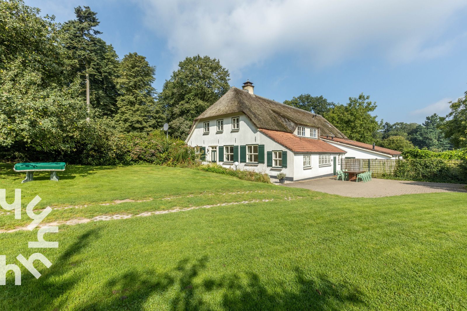 Joli jardin avec une terrasse spacieuse avec mobilier de jardin et un grand verger/parc à gazon.