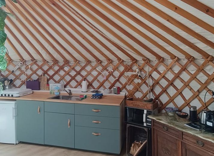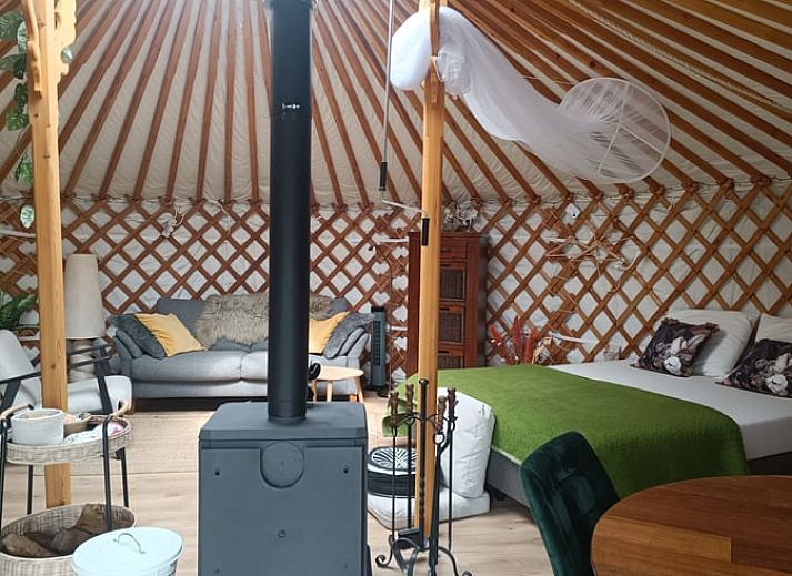 Le camping abrite une petite communauté de yourtes. La yourte De Ooievaar surplombe la prairie et dispose d'un jardin privé avec un canapé, des sièges et un foyer.