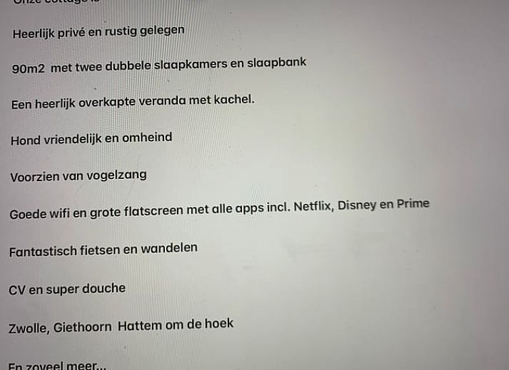 Un beau chalet spacieux (90m2) près de la forêt, de la lande et de Zwolle. Privé et fermé avec toute la tranquillité de la nature. Au bord d'un petit parc tranquille avec parking, climatisation, Nespresso, lave-vaisselle, chauffage central, salon spacieux, smart TV (Disney, AppleTV, Netflix), wifi, cuisine, micro-ondes, four, deux chambres doubles avec lit double confortable, lits faits, serviettes, salle de bains, machine à laver, sèche-linge. Une grande terrasse avec auvent et bbq pour profiter de la nature les jours ensoleillés et moins ensoleillés. Un pot de beurre de cacahuètes pour les oiseaux et les écureuils. Jardin clôturé de 350 m2, forêt, zone de promenade pour chiens et superbes randonnées pédestres et cyclistes. Profitez du marché et des restaurants de Zwolle ! Ami des chiens