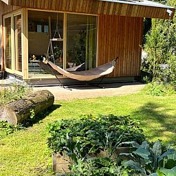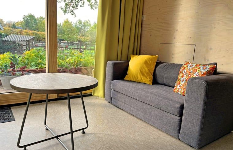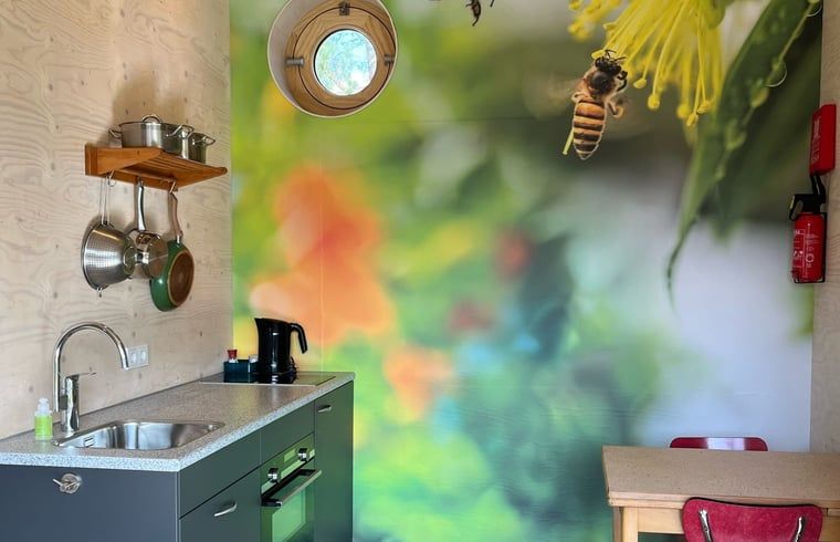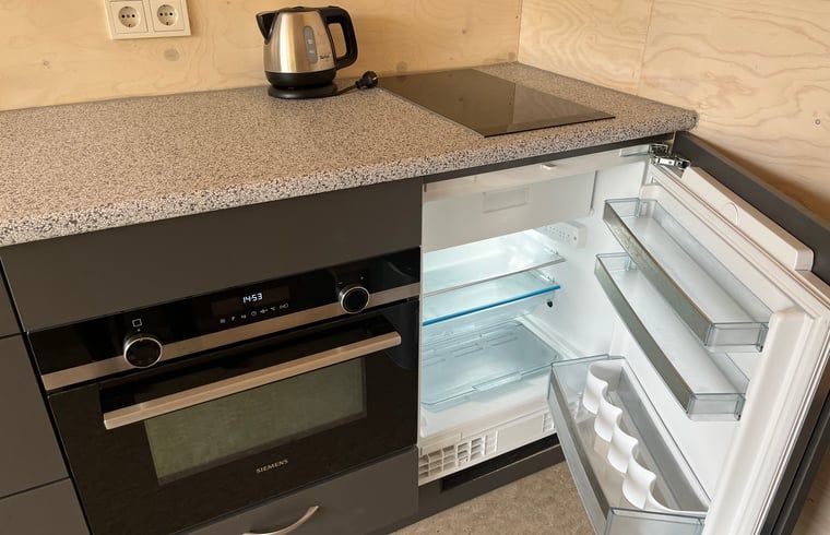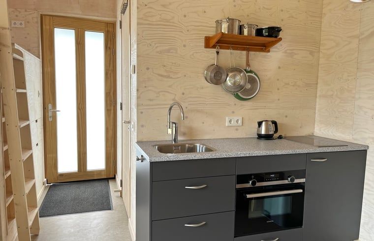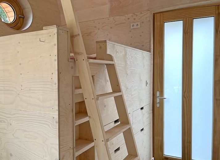 Petite maison pour 2 personnes. Elle dispose du chauffage central. Vous dormirez confortablement dans le lit du grenier accessible par des escaliers. La salle de bains est équipée d'une luxueuse douche à l'italienne. Il y a également un coin repas avec une kitchenette équipée d'une plaque à induction à 2 feux et un coin salon avec un canapé-lit et un fauteuil. Nous donnons une seconde vie aux meubles. Ils sont plus durables que les meubles neufs. Le cottage n'est pas raccordé au gaz et ne coûte donc pas de gaz. L'électricité est fournie par huit panneaux solaires. Avec quatre autres Tiny Houses, le cottage jouxte une clairière avec une terrasse en tronc d'arbre. À proximité se trouve une forêt nourricière où vous pouvez jeter un coup d'œil et cueillir des herbes pour préparer un repas.