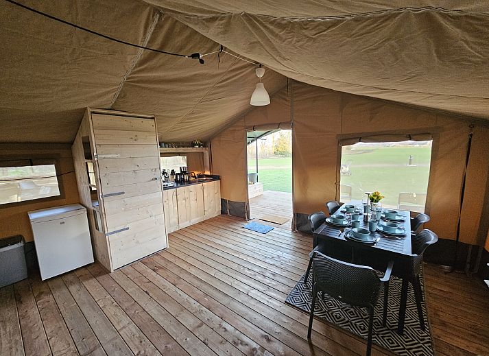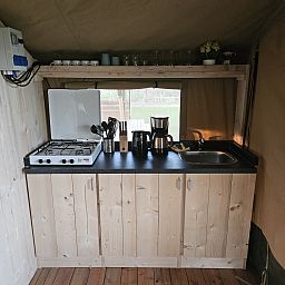 Cette tente de safari unique est entièrement équipée pour des vacances glamping parfaites ! La tente dispose d'une véranda confortable avec auvent, d'une cuisine entièrement équipée avec inventaire et de deux compartiments de couchage. Il y a également des toilettes dans cette tente de safari, pour un peu plus de confort.