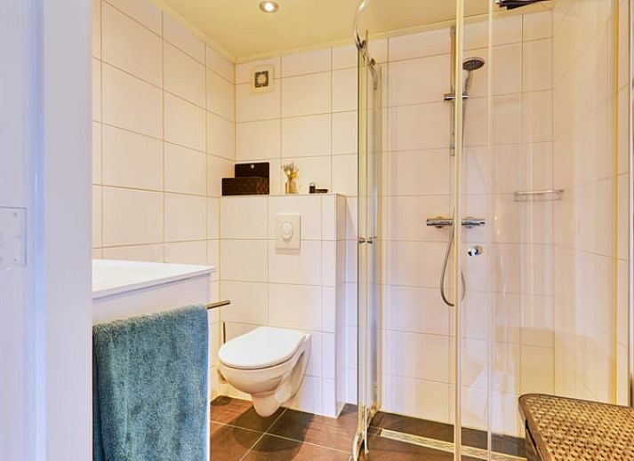 La salle de bains est équipée d'une douche, de toilettes et d'un meuble de rangement.