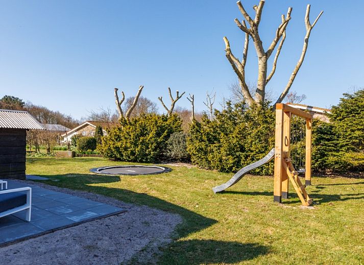Pour les enfants, le jardin offre de nombreux équipements ludiques : une double balançoire avec toboggan et un grand trampoline.