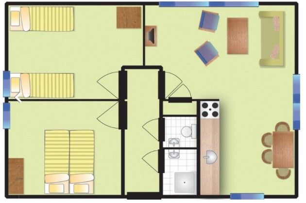 Ces cottages spacieux et indépendants sont disponibles dans différents types et tailles, tous avec douche et toilettes séparées, chambres avec moquette et parquet dans le couloir et la salle de séjour. Ce cottage dispose de deux chambres doubles ou d'une chambre double et de deux chambres simples avec des lits à ressorts. La cuisine bien équipée comprend un lave-vaisselle, un micro-ondes, une hotte aspirante et un réfrigérateur encastré. Certains cottages sont équipés d'un brise-vent de luxe.