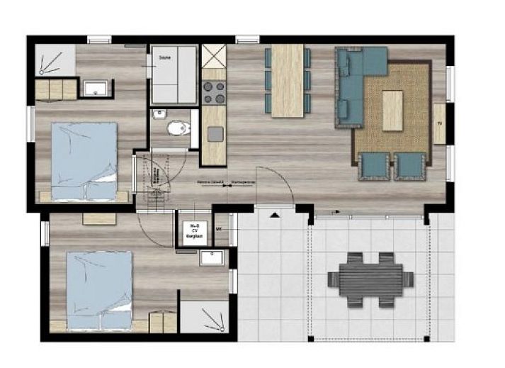 Pavillon indépendant de plain-pied pour 4 personnes. Le salon est décoré avec goût, avec un intérieur moderne, une télévision et un lecteur DVD. La cuisine est équipée d'un lave-vaisselle, d'un micro-ondes, d'un réfrigérateur avec congélateur interne et d'une cafetière. Le lodge dispose également de deux chambres à coucher, d'un sauna et d'une salle de bains avec douche et toilettes. Le lodge est également équipé d'un jardin et de meubles et vous pouvez utiliser le Wi-Fi gratuitement.