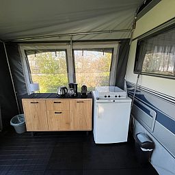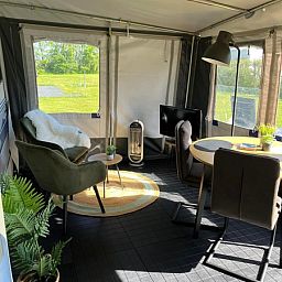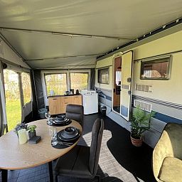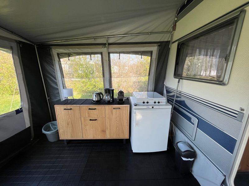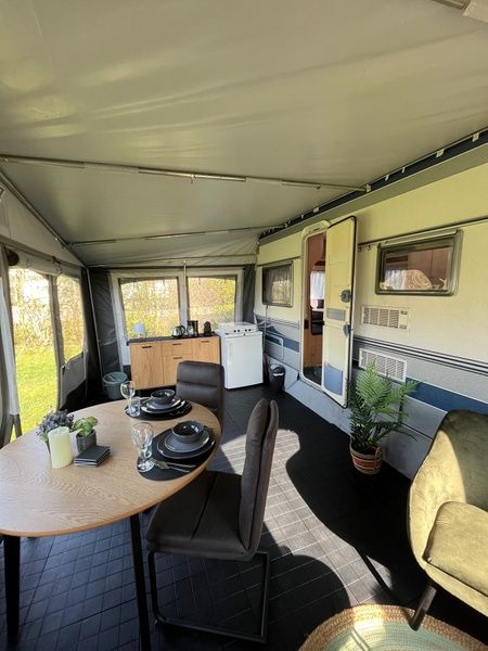 Cette caravane entièrement équipée avec auvent convient à 1 ou 2 personnes et est située sur un emplacement spacieux dans notre camping à la ferme. L'intérieur est entièrement équipé. La caravane dispose d'un lit double et d'une cuisine ouverte. Vous y trouverez un grand réfrigérateur, une cuisinière à 4 feux, une machine Nespresso, une machine à café filtre, une bouilloire, un four, une machine à sandwich, etc. Dans l'auvent, vous pouvez vous asseoir près de la télévision dans des fauteuils confortables ou prendre un repas à la table à manger. Le lit est fait, il y a un jeu de serviettes et une douche Texel. Il y a un jardin avec des meubles de jardin. Il y a des toilettes dans la caravane. Vous pouvez utiliser les toilettes, le lavabo, la douche et la machine à laver dans le bloc sanitaire commun du camping. Sans fumée et sans animaux