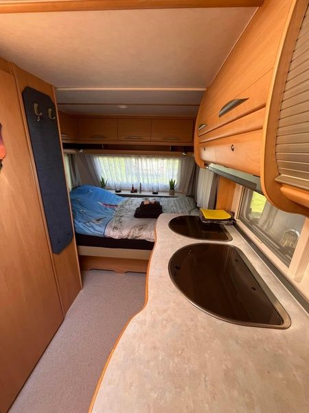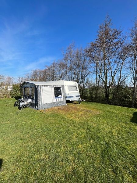 Caravane entièrement équipée avec auvent sur un camping à la ferme