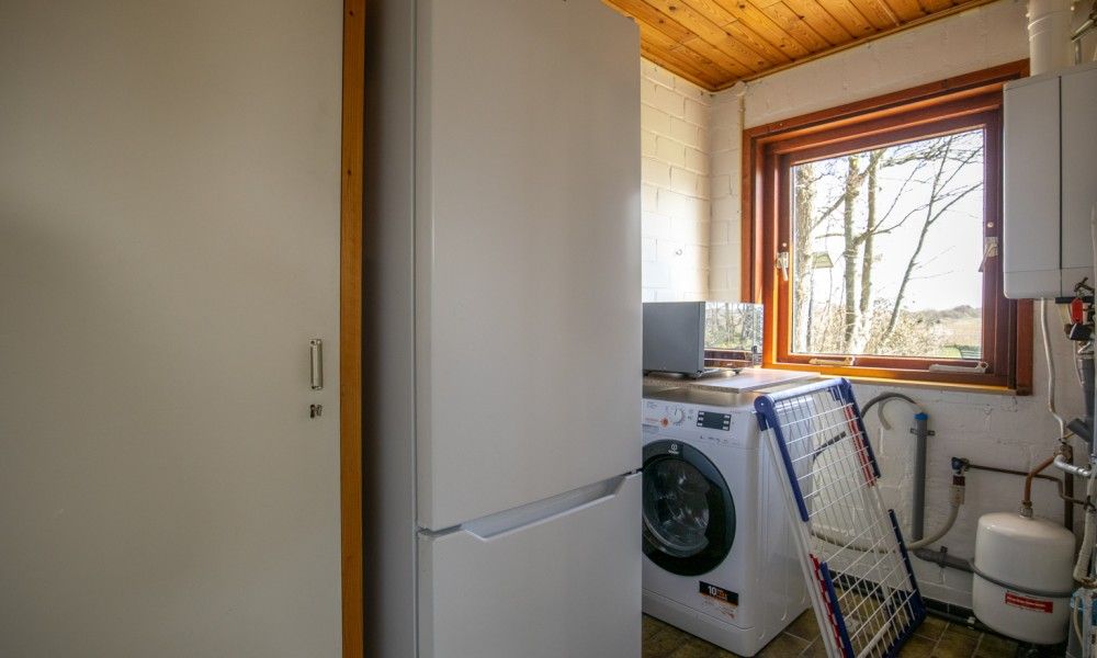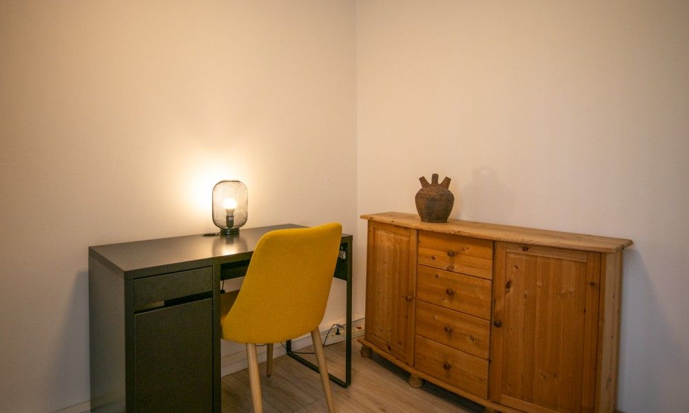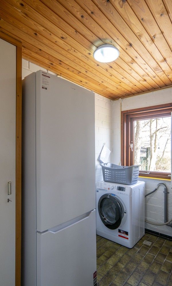 Au rez-de-chaussée se trouve le salon confortable avec coin repas. La petite cuisine entièrement équipée dispose d'une grande baie vitrée donnant sur la terrasse. Dans l'arrière-cuisine, vous trouverez un lave-linge/sèche-linge et un réfrigérateur supplémentaire avec congélateur. La salle de bains est équipée d'une douche et de toilettes. La chambre du rez-de-chaussée dispose d'un lit double et offre une vue sur le jardin. À côté de la chambre se trouve un petit bureau.
