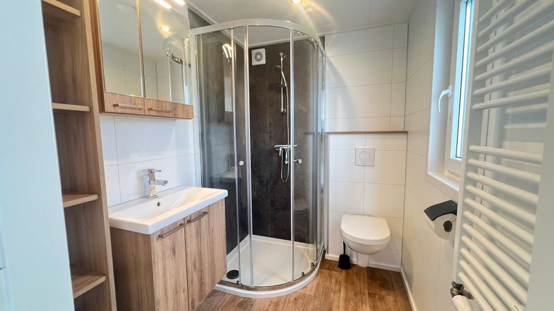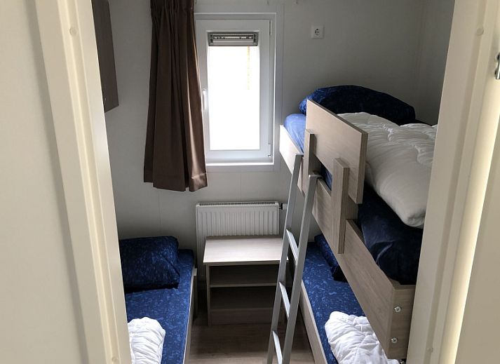 Il y a deux chambres à coucher dont ééune avec un lit double à sommier (2 matelas 80x200). L'autre chambre dispose d'un lit simple et de lits superposés, tous deux rabattables. La salle de bains spacieuse est équipée d'une douche, d'un lavabo et de toilettes. Le chalet dispose d'un jardin avec un abri et des meubles de jardin.