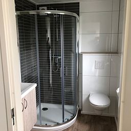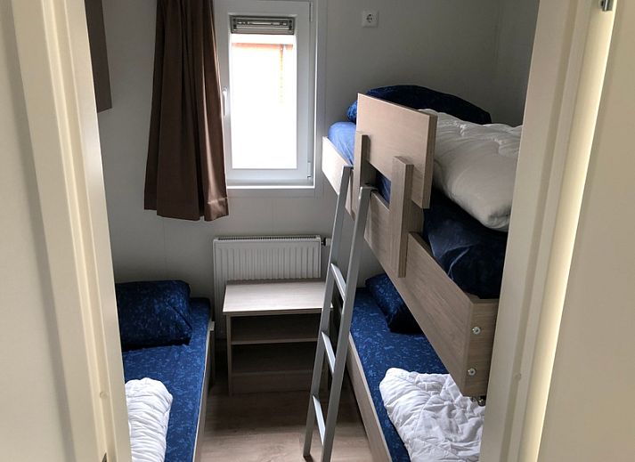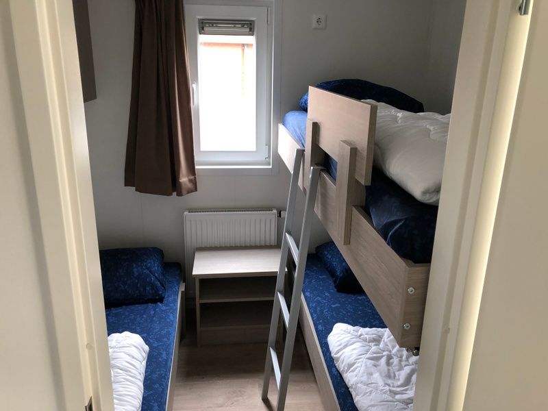 Le salon du chalet dispose d'un canapé, d'une télévision à écran plat et d'un coin repas. La cuisine ouverte est équipée d'une plaque de cuisson à 4 feux, d'un réfrigérateur avec compartiment congélateur, d'un micro-ondes, d'une cafetière à filtre et d'une bouilloire. Il y a deux chambres à coucher dont ééune avec un lit double à sommier tapissier (2 matelas 80x200). L'autre chambre dispose d'un lit simple et de lits superposés, tous deux escamotables. La salle de bains spacieuse est équipée d'une douche, d'un lavabo et de toilettes. Le chalet dispose de portes-fenêtres donnant sur le jardin et la terrasse avec mobilier de jardin. Il y a un abri dans le jardin.