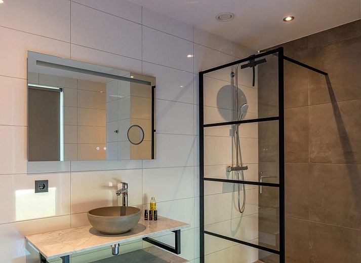 1 Chambre à coucher au rez-de-chaussée avec 2 lits simples boxspring 90x210 avec douche à l'italienne et baignoire pour 2 personnes.