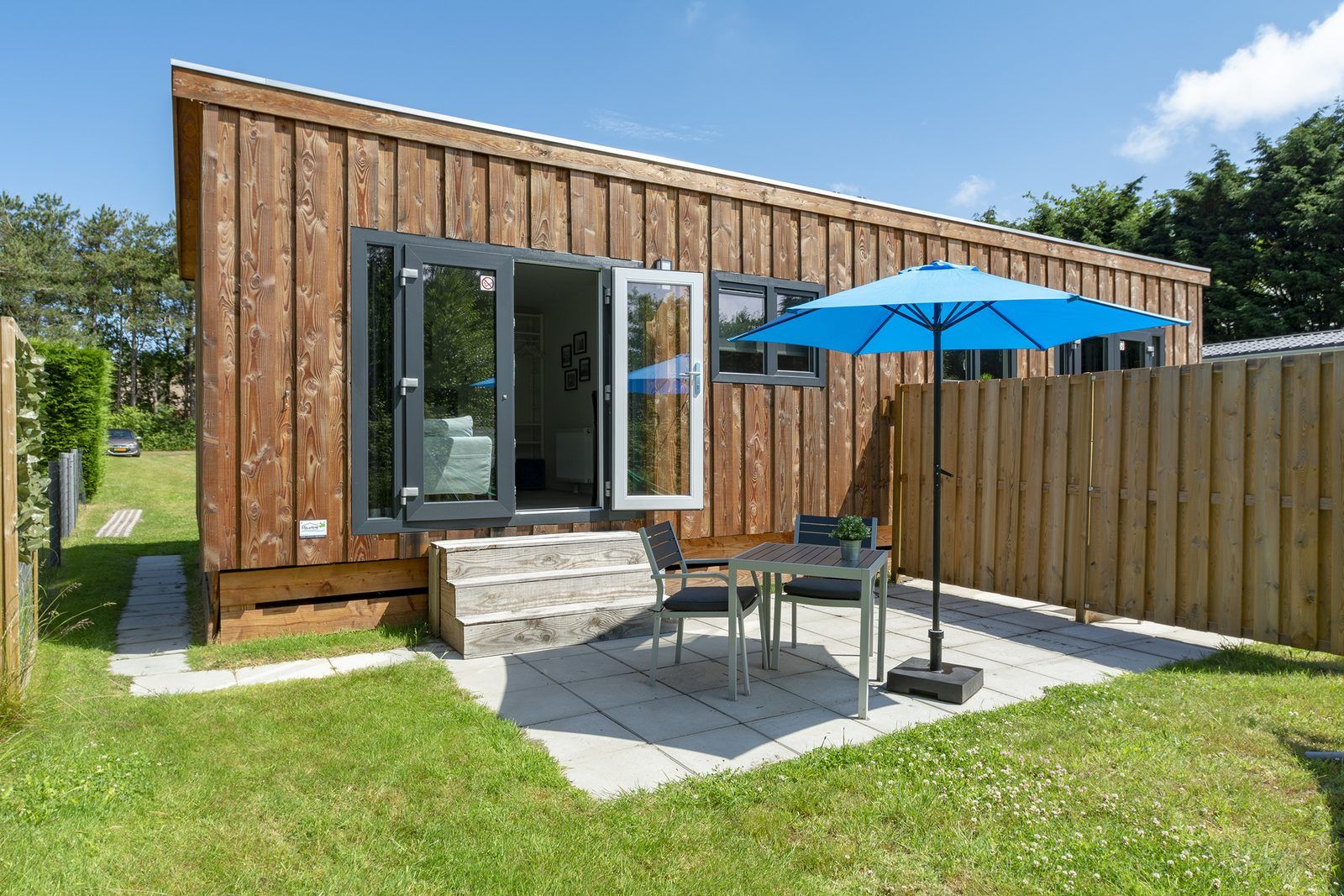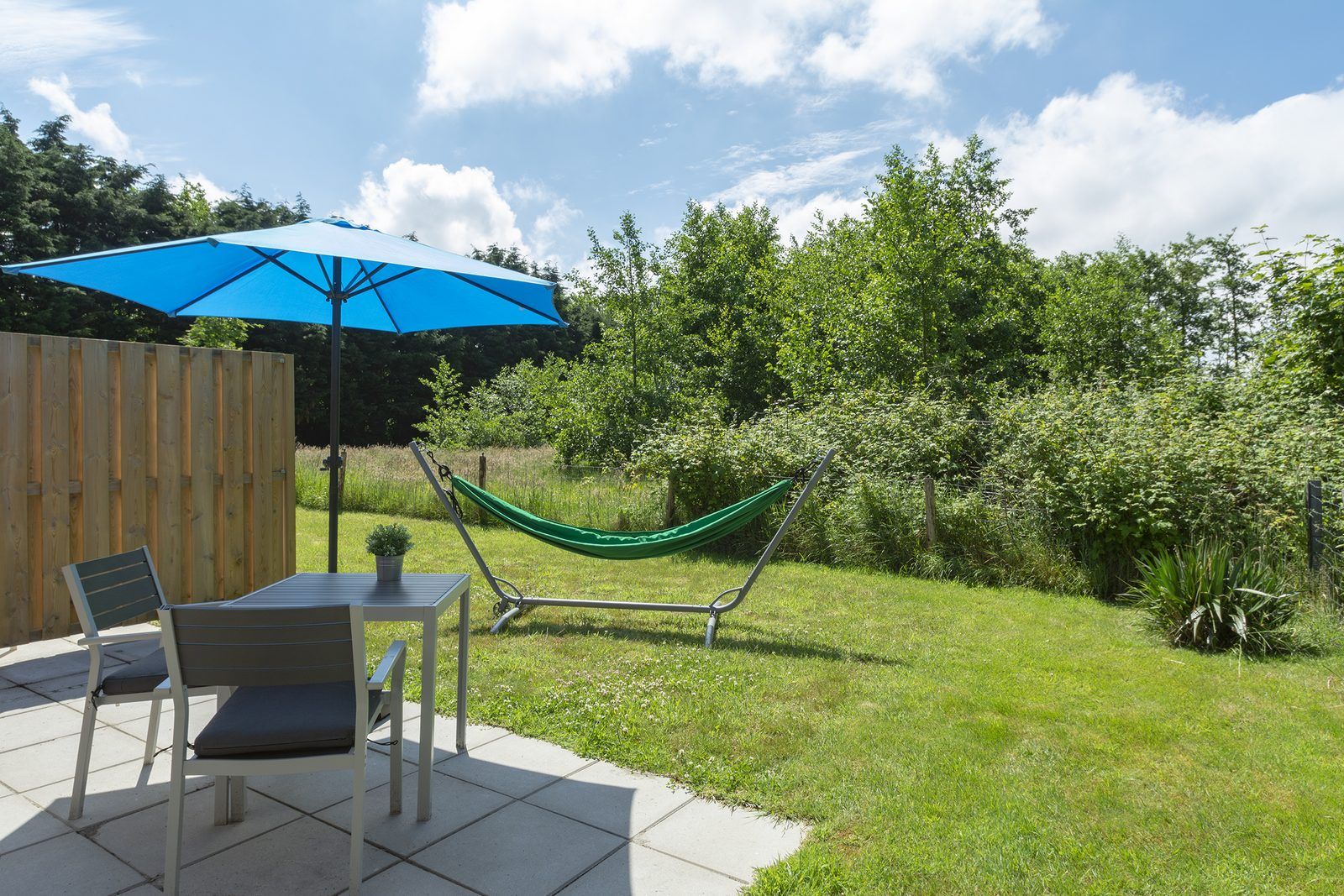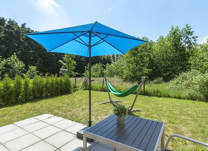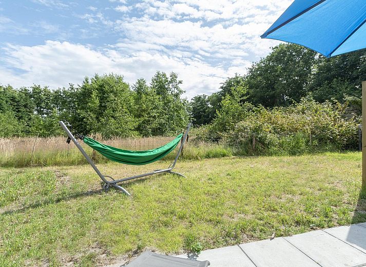 À l'extérieur, sur la terrasse, vous pourrez profiter pleinement de votre séjour, et un hamac confortable est à votre disposition ! Le jardin est séparé du chalet Mees adjacent et offre une vue sur la forêt voisine.