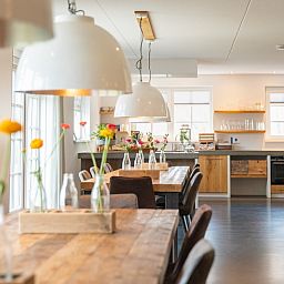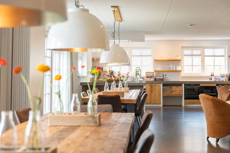 Par la double entrée, vous entrez dans les grands salons/salles à manger avec 3 poêles à bois, de généreux espaces pour s'asseoir, trois téléviseurs et une salle à manger spacieuse. Il y a une cuisine double avec 2 lave-vaisselle, 2 micro-ondes, 3 fours à convection, une double plaque à induction, de grands réfrigérateurs, des Quookers, des machines à café et un vaste inventaire de cuisine. Au rez-de-chaussée se trouve un grand hall, des toilettes et trois chambres spacieuses. Au 1er étage se trouvent neuf chambres à coucher, chacune avec sa propre salle de bains avec douche bien-être, lavabo et toilettes. Au 2ème étage se trouvent 6 chambres supplémentaires. Chaque chambre dispose d'une télévision, d'une armoire spacieuse et d'une salle de bains privée avec douche bien-être, lavabo et toilettes. Toutes les chambres sont équipées de deux lits simples à ressorts. Les lits peuvent être reliés pour former un lit double. Des portes-fenêtres s'ouvrent du salon sur votre terrasse avec des meubles de patio. La maison est située sur un beau domaine, entouré d'arbres et bordé de prairies.