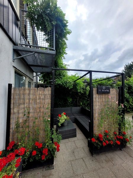 La cuisine est équipée d'une cuisinière à gaz, d'un réfrigérateur, d'un lave-vaisselle, d'un micro-ondes, d'un four, d'une cafetière, d'un Nespresso, d'un grille-pain et d'un mixeur plongeant. Il y a également un coin repas. La salle de bains est équipée d'une douche, d'un lavabo et de toilettes. À l'étage, la salle de séjour comprend un coin salon avec canapé-lit, une télévision et un lecteur DVD. Il y a également un lit d'appoint (1,60 m). La chambre à coucher est équipée d'un lit double (deux matelas simples et couettes). L'appartement dispose d'un jardin commun avec un coin salon, accessible par le débarras.