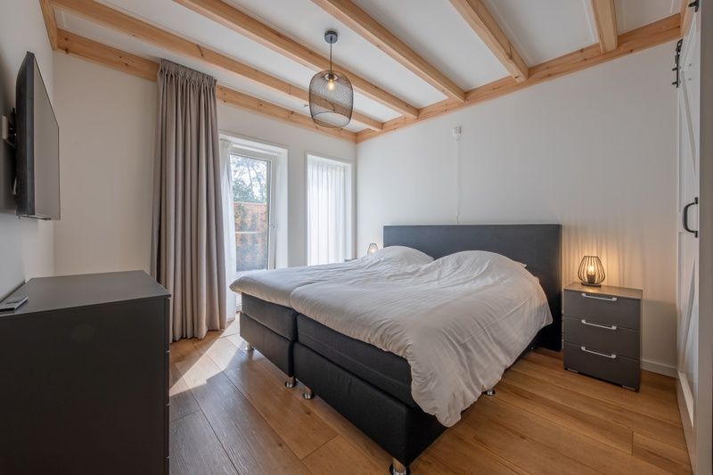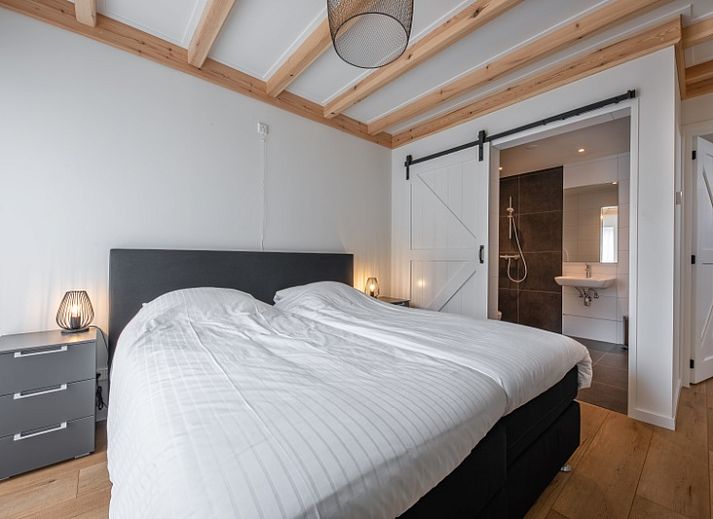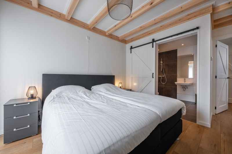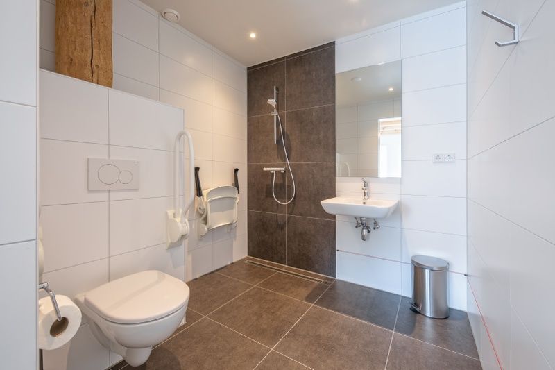 La chambre au rez-de-chaussée est équipée d'aménagements pour les personnes handicapées : un lit à sommier surélevé, des portes de 93 cm de large et une salle de bains avec douche avec chaise de douche pliante et toilettes avec accoudoirs.
